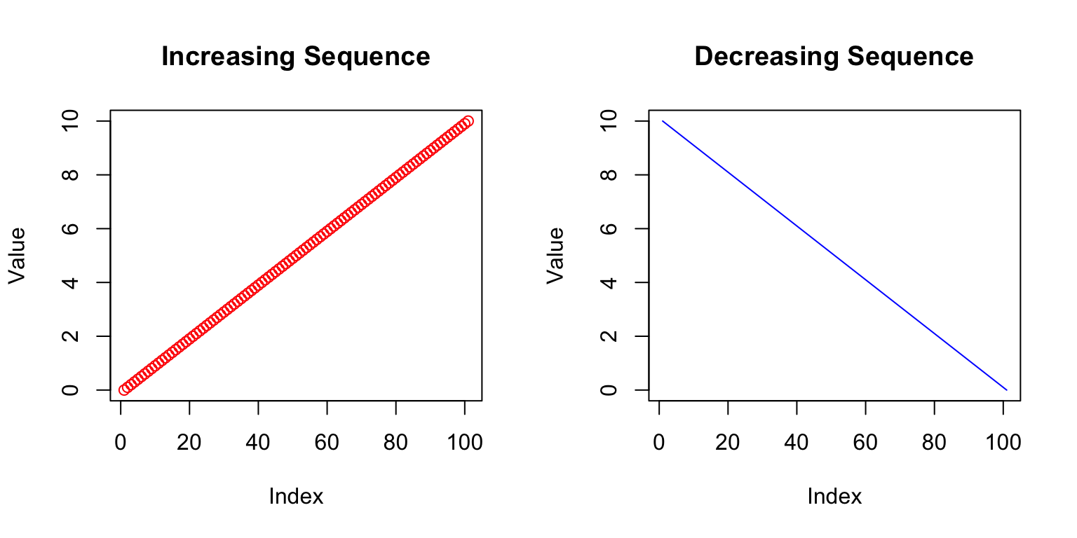 Create a sequence variable using seq() and make two different plots by changing the type argument ("p" for points, "l" for lines, "b" for both)