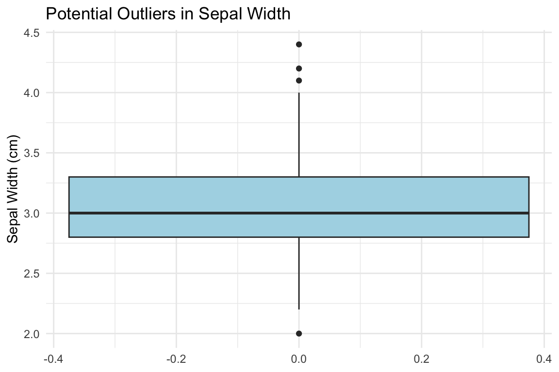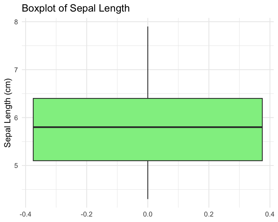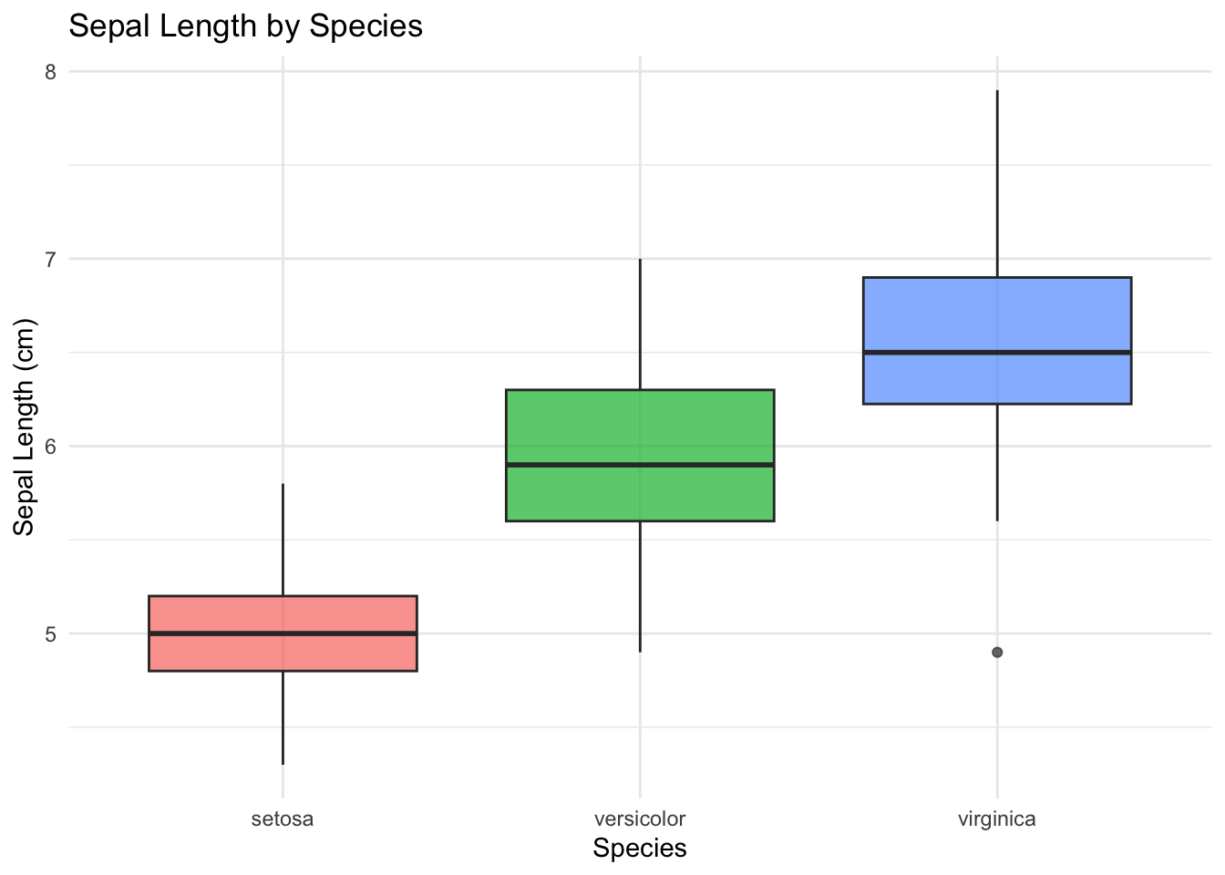 ggplot(iris, aes(x = Species, y = Sepal.Length, fill = Species)) +geom_boxplot(alpha =0.7, show.legend =FALSE) +labs(x ="Species",y ="Sepal Length (cm)",title ="Sepal Length by Species") +theme_minimal()