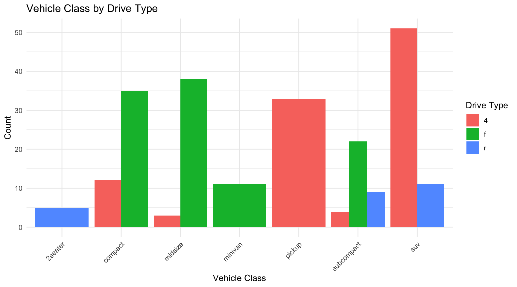 ggplot(mpg, aes(x = class, fill = drv)) +geom_bar(position ="dodge") +labs(x ="Vehicle Class",y ="Count",fill ="Drive Type",title ="Vehicle Class by Drive Type") +theme_minimal() +theme(axis.text.x =element_text(angle =45, hjust =1))