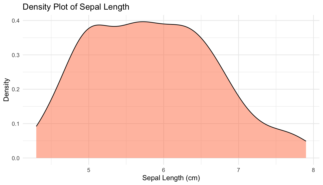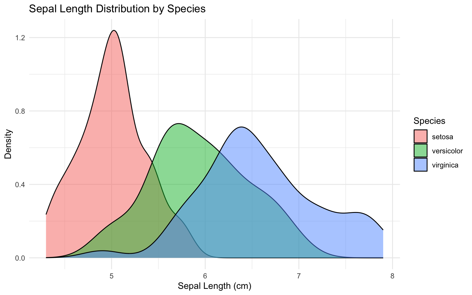 ggplot(iris, aes(x = Sepal.Length, fill = Species)) +geom_density(alpha =0.5) +labs(x ="Sepal Length (cm)",y ="Density",title ="Sepal Length Distribution by Species") +theme_minimal()