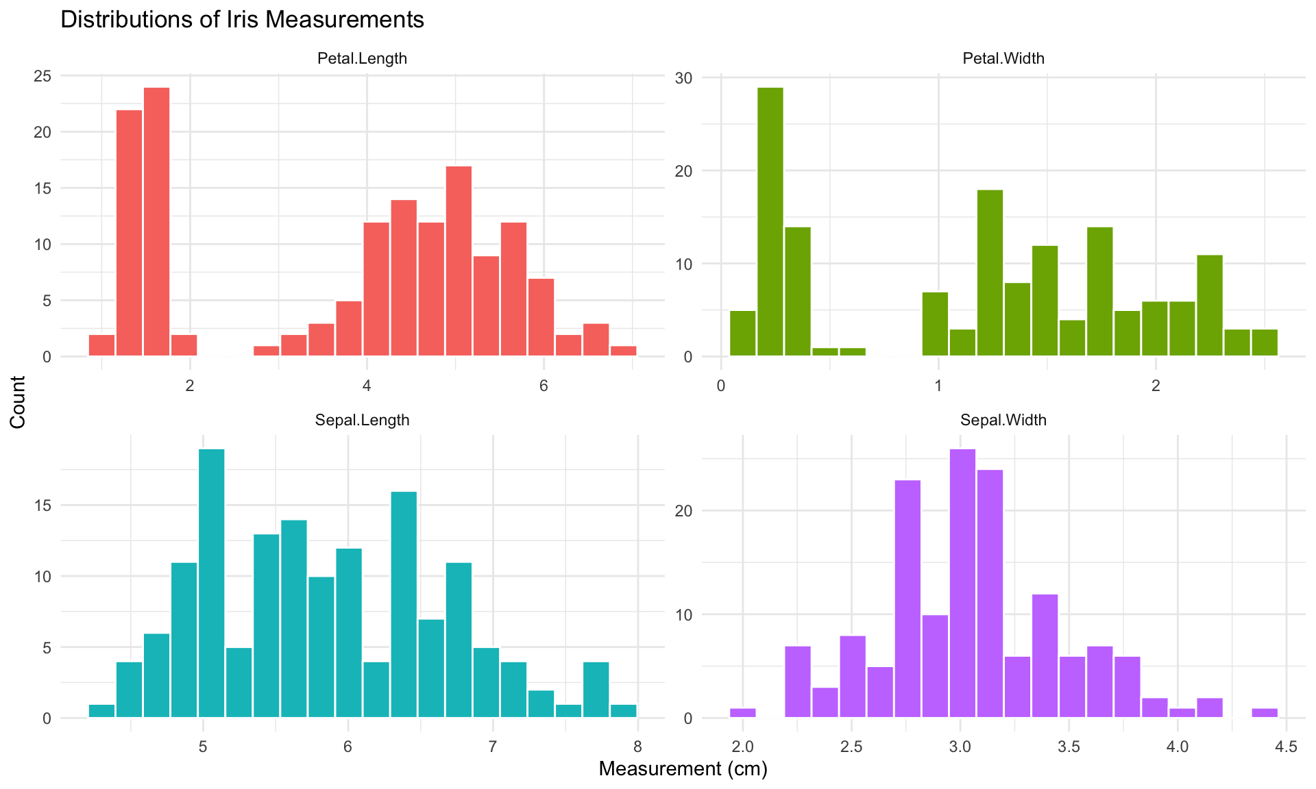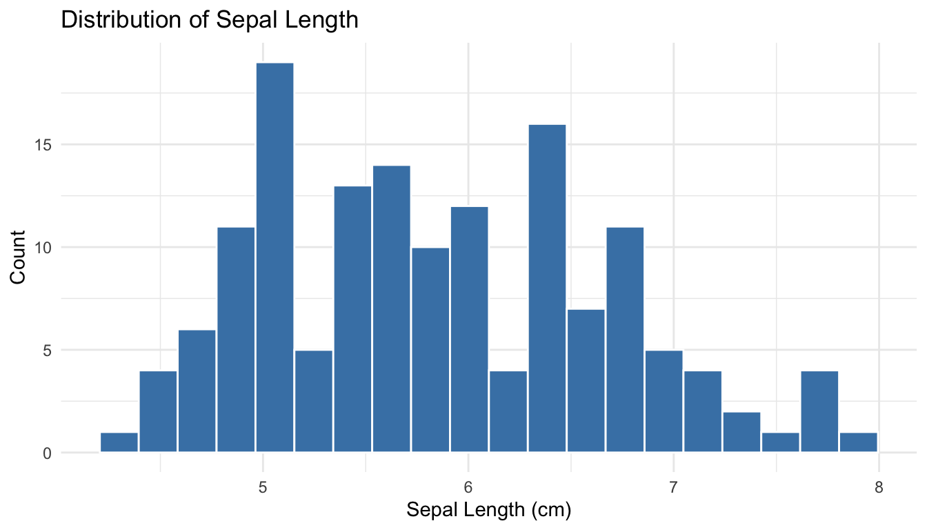 ggplot(iris, aes(x = Sepal.Length)) +geom_histogram(bins =20, fill ="steelblue", color ="white") +labs(x ="Sepal Length (cm)",y ="Count",title ="Distribution of Sepal Length") +theme_minimal()