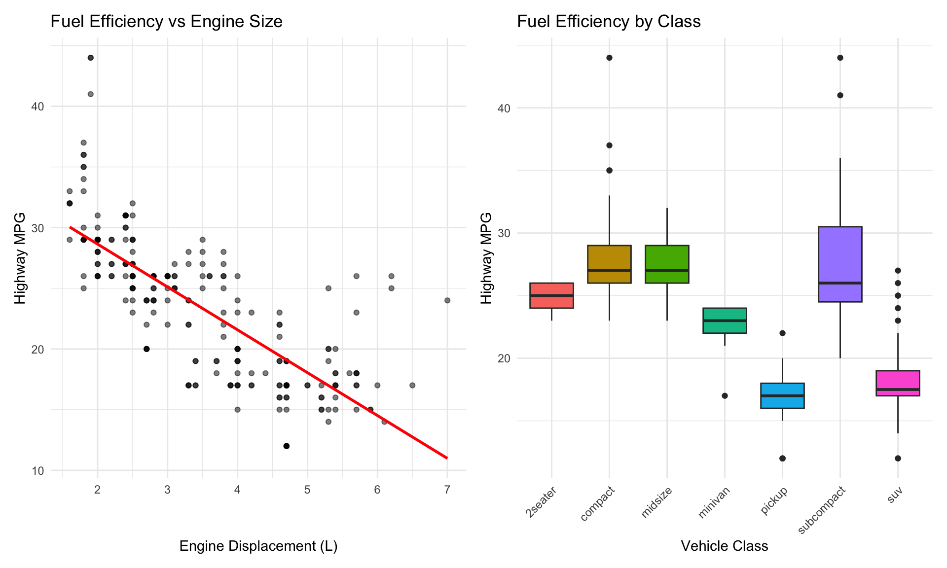 p1 <-ggplot(mpg, aes(x = displ, y = hwy)) +geom_point(alpha =0.5) +geom_smooth(method ="lm", se =FALSE, color ="red") +labs(x ="Engine Displacement (L)",y ="Highway MPG",title ="Fuel Efficiency vs Engine Size") +theme_minimal()p2 <-ggplot(mpg, aes(x = class, y = hwy, fill = class)) +geom_boxplot(show.legend =FALSE) +labs(x ="Vehicle Class",y ="Highway MPG",title ="Fuel Efficiency by Class") +theme_minimal() +theme(axis.text.x =element_text(angle =45, hjust =1))p1 + p2