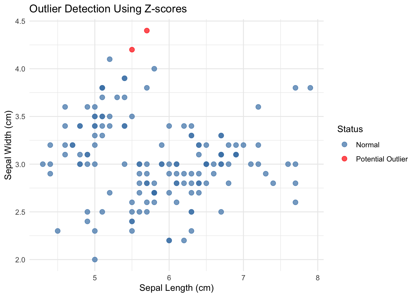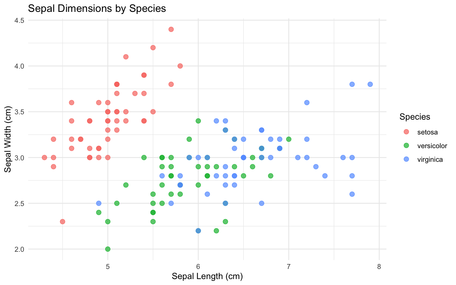 ggplot(iris, aes(x = Sepal.Length, y = Sepal.Width, color = Species)) +geom_point(alpha =0.7, size =2.5) +labs(x ="Sepal Length (cm)",y ="Sepal Width (cm)",title ="Sepal Dimensions by Species") +theme_minimal()