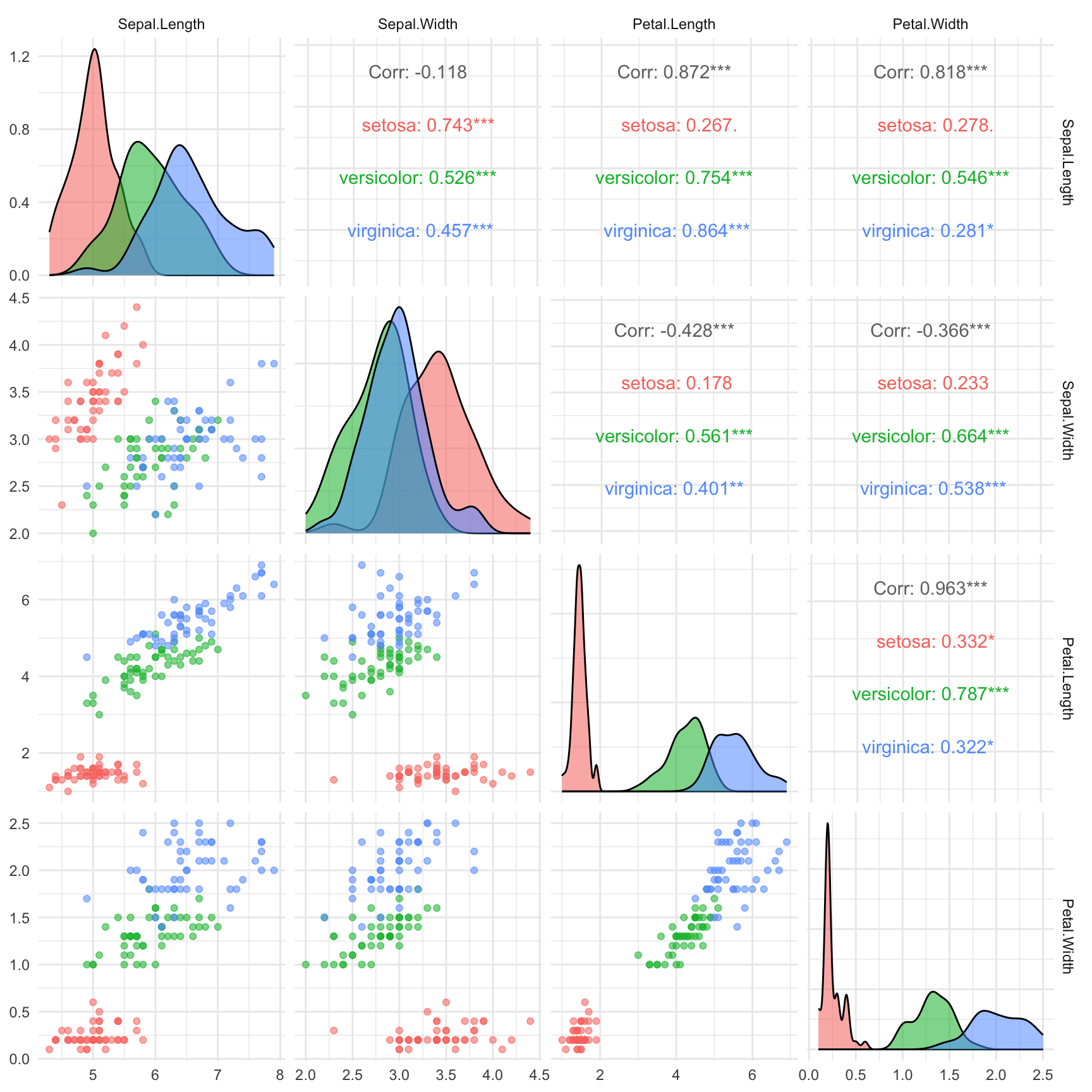 # Using GGally package for pairs plotif (!require(GGally)) install.packages("GGally")library(GGally)ggpairs(iris,columns =1:4,aes(color = Species, alpha =0.5),upper =list(continuous ="cor"),lower =list(continuous ="points")) +theme_minimal()