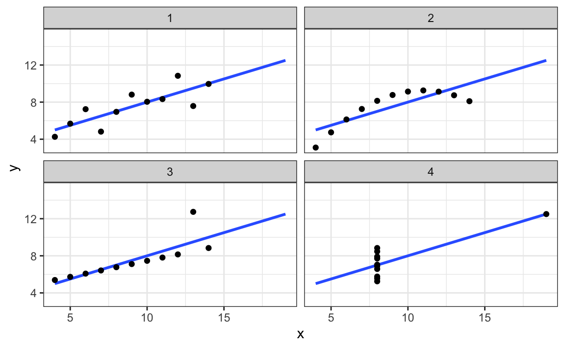Figure 9.2: Anscombe’s Quartet: four datasets with nearly identical summary statistics (same means, variances, correlations, and regression lines) but strikingly different patterns when visualized. This classic example demonstrates why visualization is essential—summary statistics alone can be profoundly misleading.