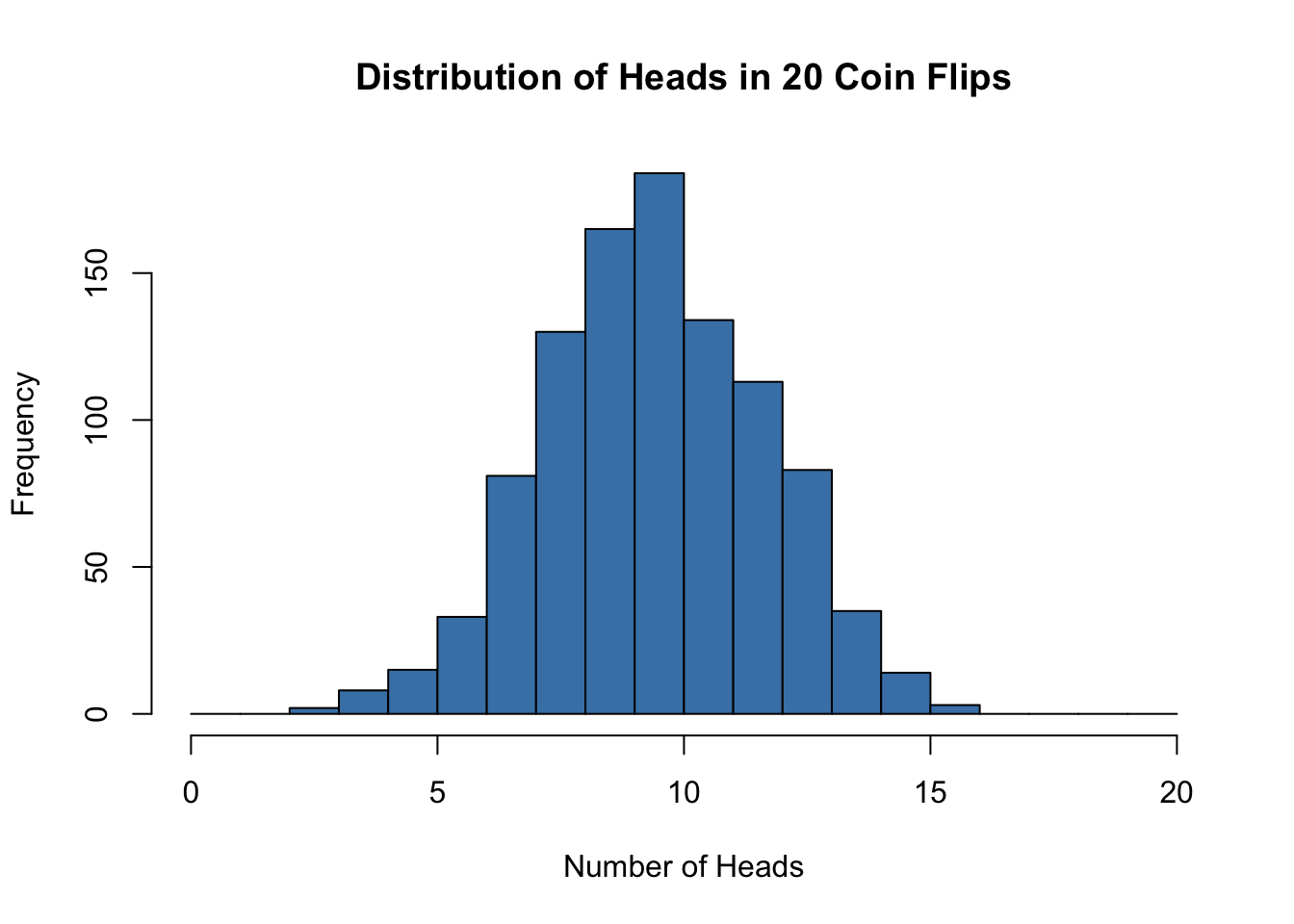 heads <- rbinom(n = 1000, size = 20, prob = 0.5)