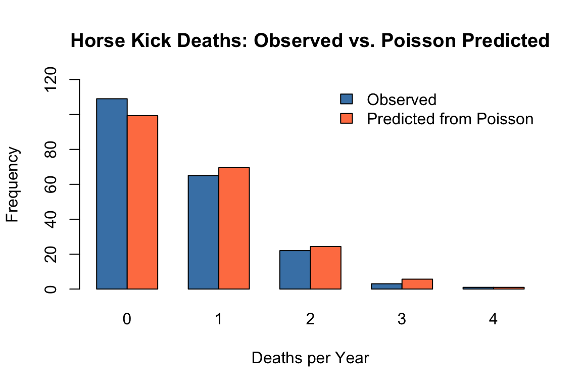 main = "Horse Kick Deaths: Observed vs. Poisson Predicted")
