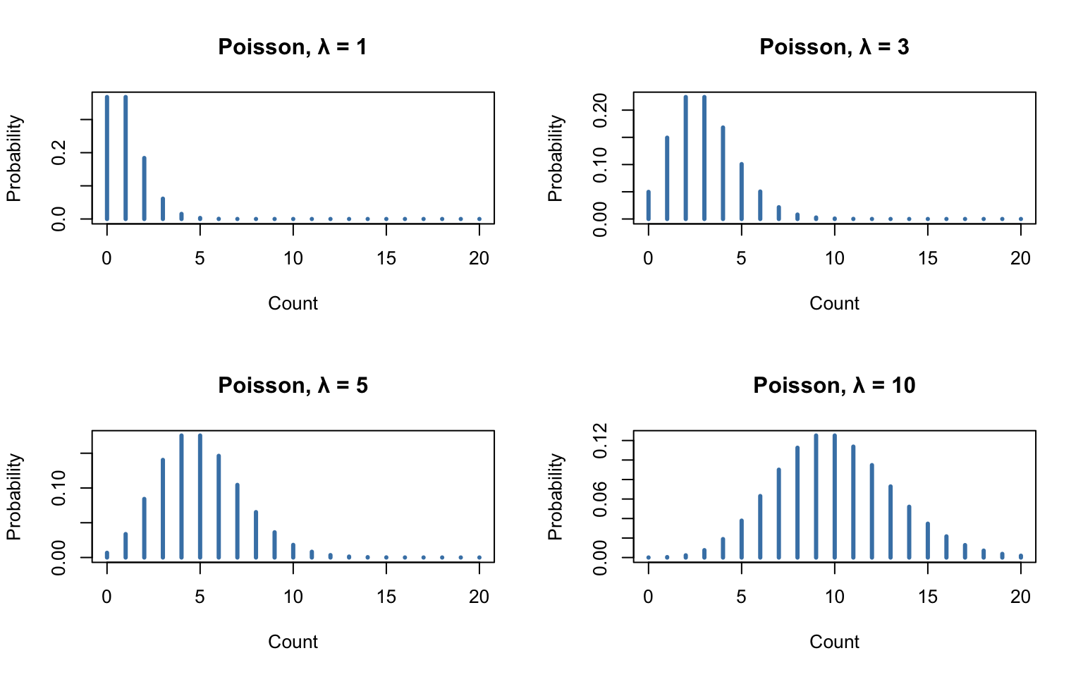 A remarkable property of the Poisson distribution is that the mean and variance are both equal to \(\lambda\). This provides a simple check: if your count data has variance much larger than its mean, a simple Poisson model may not be appropriate (a situation called overdispersion, common in biological data).