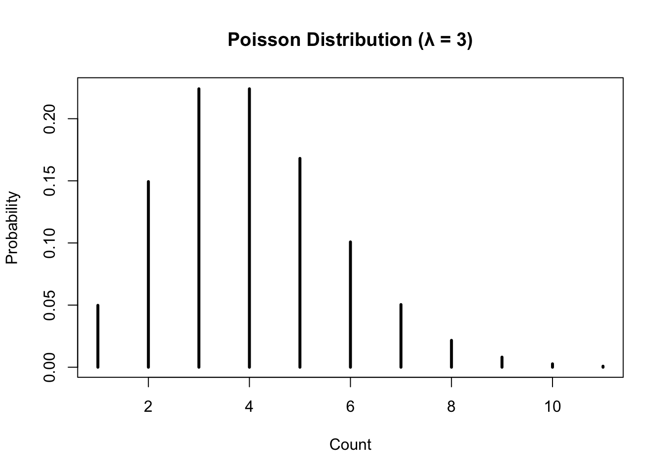 cat("Poisson (λ = 5):\n")Poisson (λ = 5):