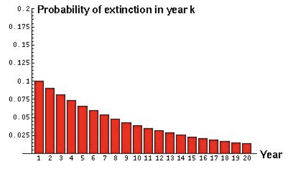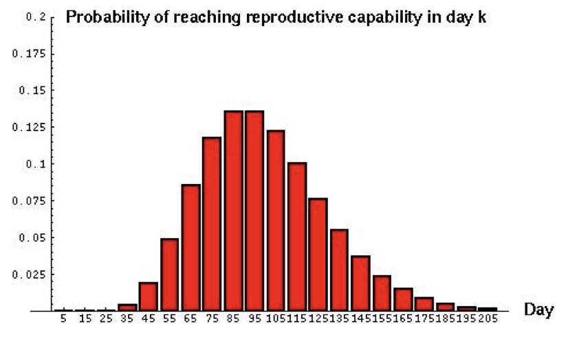 Consider a predator that must capture 10 prey to reach reproductive maturity. If the daily probability of catching prey is 0.1, the negative binomial distribution describes when the predator will be ready to reproduce.