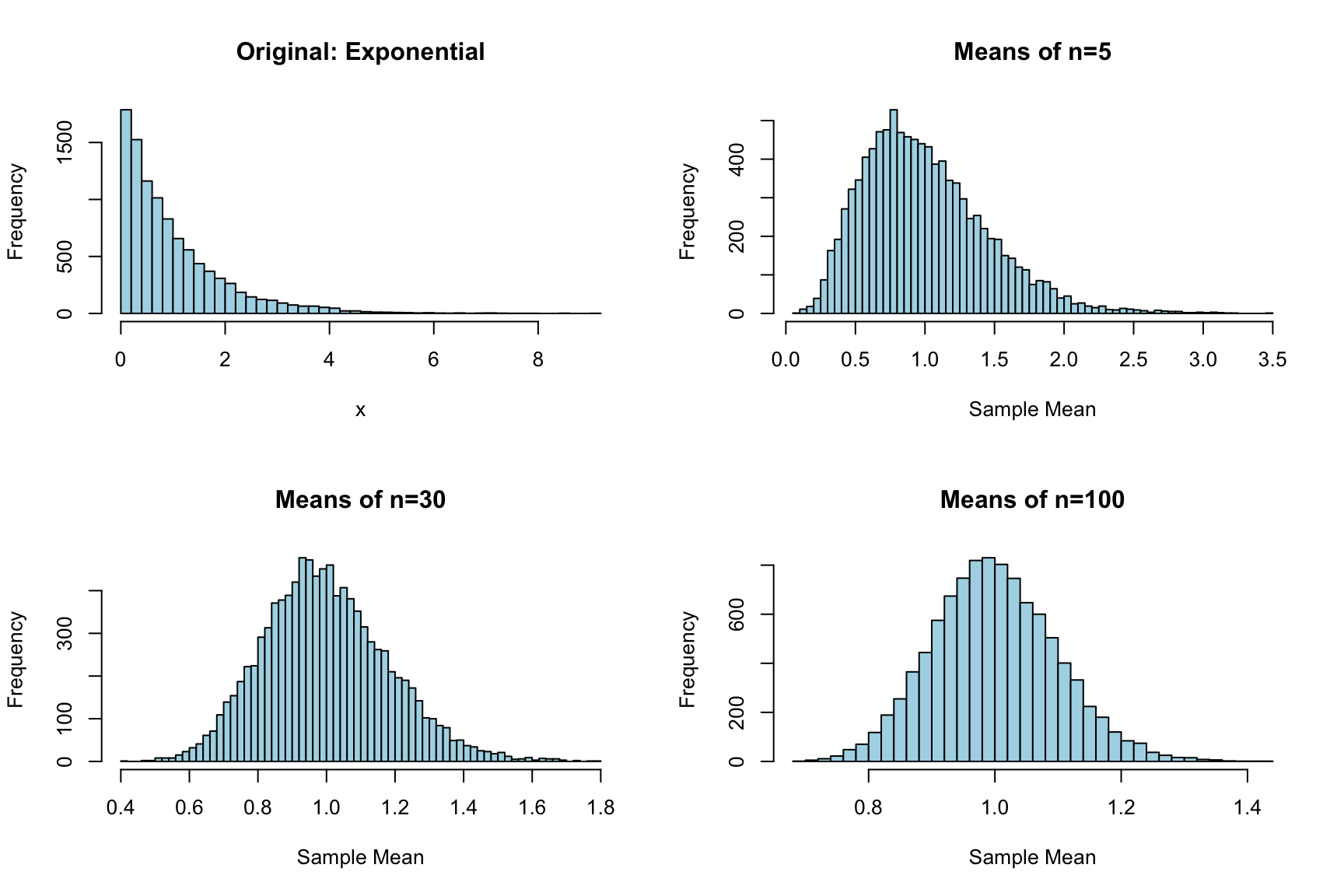 Even though the exponential distribution is strongly right-skewed, the distribution of sample means becomes increasingly normal as sample size grows. This is the Central Limit Theorem in action.