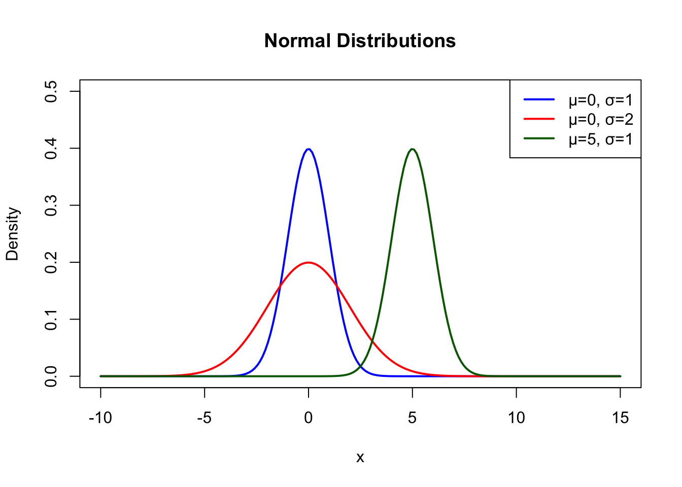legend = c("μ=0, σ=1", "μ=0, σ=2", "μ=5, σ=1"),