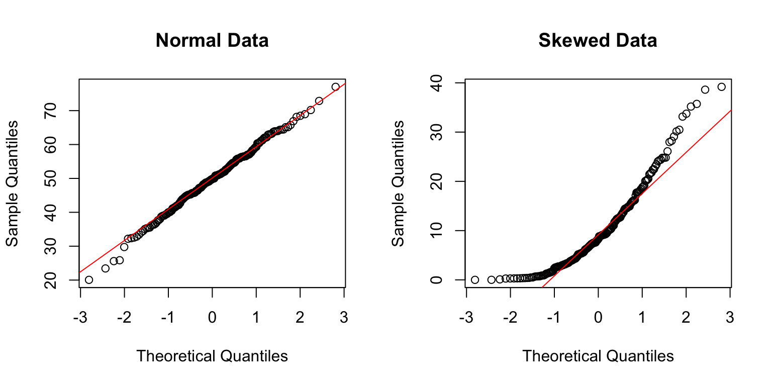 In a Q-Q plot, normally distributed data should fall approximately along the diagonal line. Systematic deviations indicate non-normality.