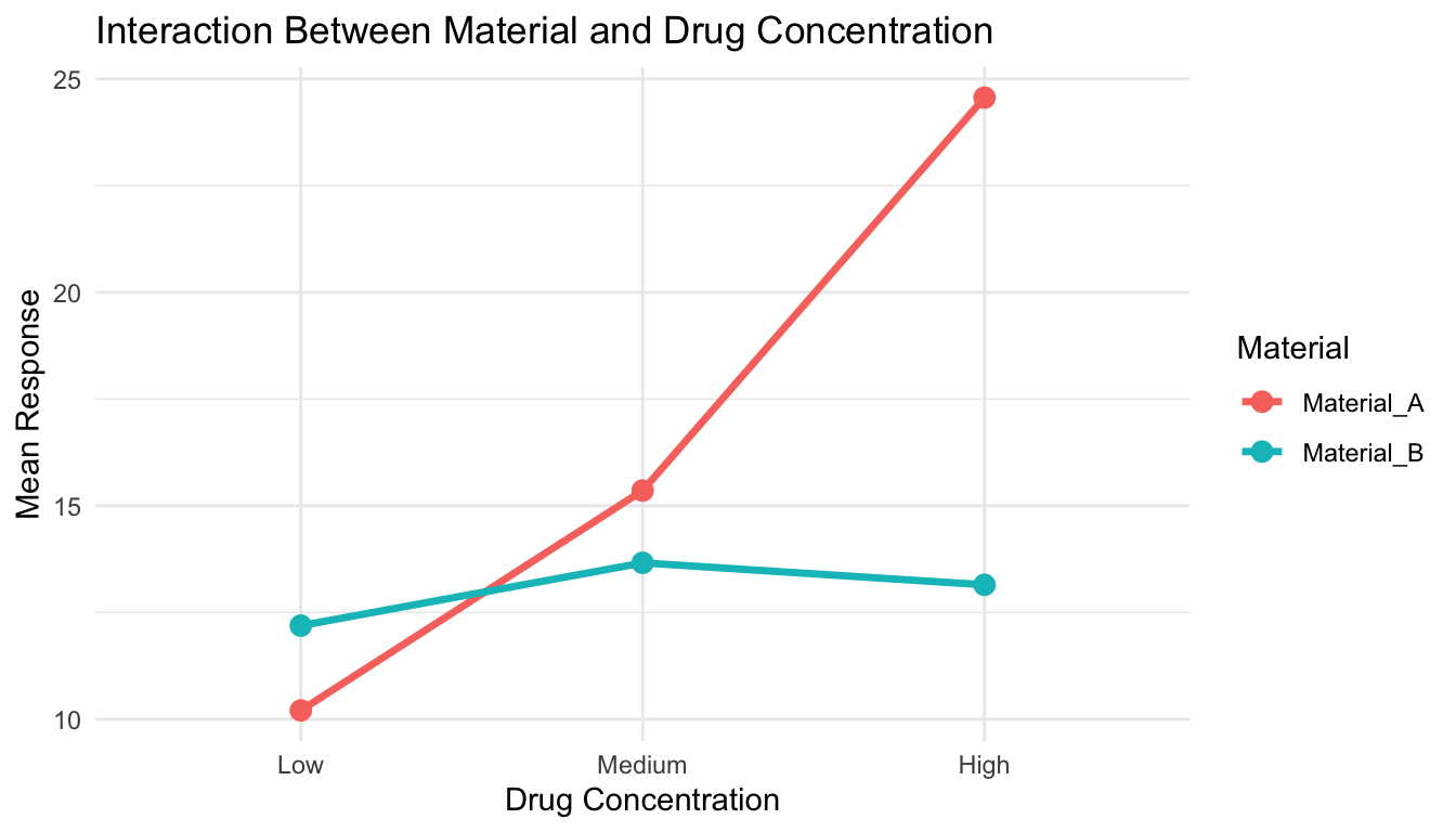Draw a hypothetical interaction plot showing an interaction between material and oxygen