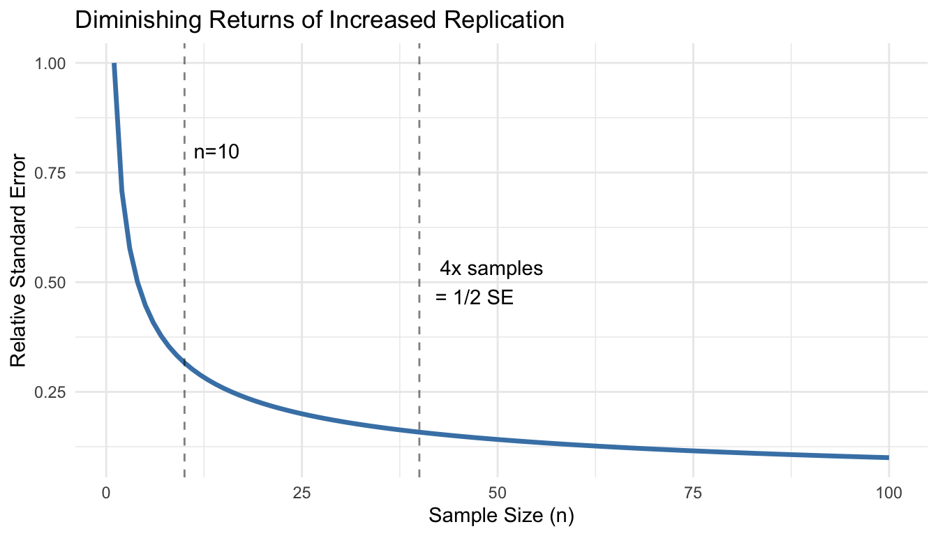 # Relationship between sample size and standard errorn <-1:100se_relative <-1/sqrt(n)ggplot(data.frame(n = n, se = se_relative), aes(x = n, y = se)) +geom_line(color ="steelblue", size =1.2) +geom_vline(xintercept =c(10, 40), linetype ="dashed", alpha =0.5) +annotate("text", x =10, y =0.8, label ="n=10", hjust =-0.2) +annotate("text", x =40, y =0.5, label ="4x samples\n= 1/2 SE", hjust =-0.2) +labs(title ="Diminishing Returns of Increased Replication",x ="Sample Size (n)",y ="Relative Standard Error") +theme_minimal()
