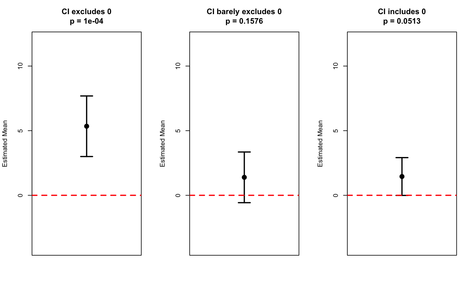 # Demonstrate the CI-pvalue relationshipset.seed(42)# Three scenariosscenarios <-list(list(true_mean =5, label ="CI excludes 0"),list(true_mean =2, label ="CI barely excludes 0"),list(true_mean =0.5, label ="CI includes 0"))par(mfrow =c(1, 3))for (scenario in scenarios) { sample_data <-rnorm(30, mean = scenario$true_mean, sd =5) result <-t.test(sample_data)# Plot CI ci <- result$conf.int mean_est <- result$estimateplot(1, mean_est, xlim =c(0.5, 1.5), ylim =c(-4, 12),pch =19, cex =1.5, xaxt ="n", xlab ="",ylab ="Estimated Mean",main =paste0(scenario$label, "\np = ", round(result$p.value, 4)))arrows(1, ci[1], 1, ci[2], angle =90, code =3, length =0.1, lwd =2)abline(h =0, col ="red", lty =2, lwd =2)}