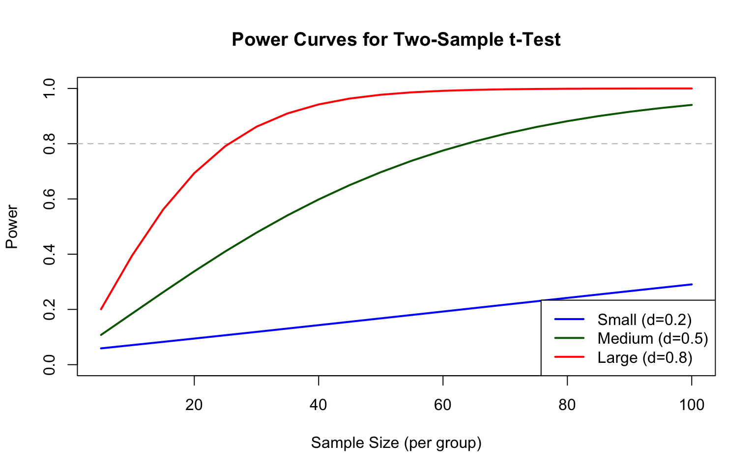 # Visualize how power depends on effect size and sample sizelibrary(pwr)# Power curves for different effect sizeseffect_sizes <-c(0.2, 0.5, 0.8) # Cohen's d: small, medium, largesample_sizes <-seq(5, 100, by =5)par(mfrow =c(1, 1))colors <-c("blue", "darkgreen", "red")plot(NULL, xlim =c(5, 100), ylim =c(0, 1),xlab ="Sample Size (per group)", ylab ="Power",main ="Power Curves for Two-Sample t-Test")abline(h =0.8, lty =2, col ="gray")for (i in1:3) { powers <-sapply(sample_sizes, function(n) {pwr.t.test(n = n, d = effect_sizes[i], sig.level =0.05, type ="two.sample")$power })lines(sample_sizes, powers, col = colors[i], lwd =2)}legend("bottomright",legend =c("Small (d=0.2)", "Medium (d=0.5)", "Large (d=0.8)"),col = colors, lwd =2)