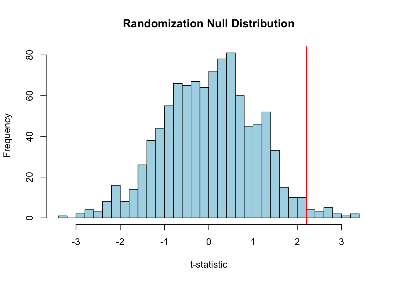 # Two groups to compareset.seed(56)pop_1 <-rnorm(n =50, mean =20.1, sd =2)pop_2 <-rnorm(n =50, mean =19.3, sd =2)# Observed t-statistict_obs <-t.test(x = pop_1, y = pop_2, alternative ="greater")$statistic# Create null distribution by randomizationpops_comb <-c(pop_1, pop_2)t_rand <-replicate(1000, { pops_shuf <-sample(pops_comb)t.test(x = pops_shuf[1:50], y = pops_shuf[51:100], alternative ="greater")$statistic})# Plot null distributionhist(t_rand, breaks =30, main ="Randomization Null Distribution",xlab ="t-statistic", col ="lightblue")abline(v = t_obs, col ="red", lwd =2)