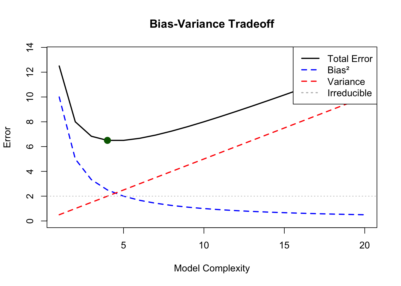 Figure 20.4: The bias-variance tradeoff showing how total prediction error decomposes into bias squared, variance, and irreducible error, with optimal model complexity at the minimum total error