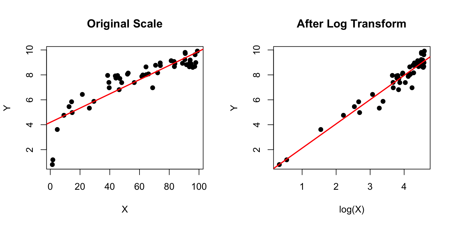 # Example: log transformationset.seed(42)x <-runif(50, 1, 100)y <-2*log(x) +rnorm(50, sd =0.5)par(mfrow =c(1, 2))# Raw scale - looks nonlinearplot(x, y, pch =19, main ="Original Scale",xlab ="X", ylab ="Y")abline(lm(y ~ x), col ="red", lwd =2)# Log scale - linearplot(log(x), y, pch =19, main ="After Log Transform",xlab ="log(X)", ylab ="Y")abline(lm(y ~log(x)), col ="red", lwd =2)