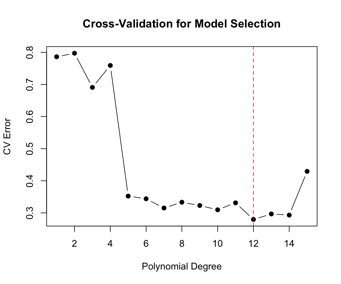 library(boot)# Compare polynomial degrees using cross-validationset.seed(42)n <-100x <-seq(0, 4*pi, length.out = n)y <-sin(x) +rnorm(n, sd =0.5)data_cv <-data.frame(x, y)# Calculate CV error for different polynomial degreesdegrees <-1:15cv_errors <-sapply(degrees, function(d) { model <-glm(y ~poly(x, d), data = data_cv)cv.glm(data_cv, model, K =10)$delta[1]})plot(degrees, cv_errors, type ="b", pch =19,xlab ="Polynomial Degree", ylab ="CV Error",main ="Cross-Validation for Model Selection")abline(v =which.min(cv_errors), col ="red", lty =2)