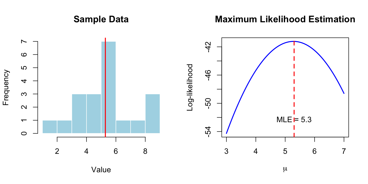 # Visualize likelihood for estimating a meanset.seed(123)data <-rnorm(20, mean =5, sd =2)# Calculate log-likelihood for different values of mumu_values <-seq(3, 7, length.out =100)log_lik <-sapply(mu_values, function(mu) {sum(dnorm(data, mean = mu, sd =2, log =TRUE))})par(mfrow =c(1, 2))# Data histogramhist(data, breaks =10, main ="Sample Data", xlab ="Value",col ="lightblue", border ="white")abline(v =mean(data), col ="red", lwd =2)# Log-likelihood curveplot(mu_values, log_lik, type ="l", lwd =2, col ="blue",xlab =expression(mu), ylab ="Log-likelihood",main ="Maximum Likelihood Estimation")abline(v = mu_values[which.max(log_lik)], col ="red", lwd =2, lty =2)text(mu_values[which.max(log_lik)], min(log_lik) +2,paste("MLE =", round(mu_values[which.max(log_lik)], 2)))