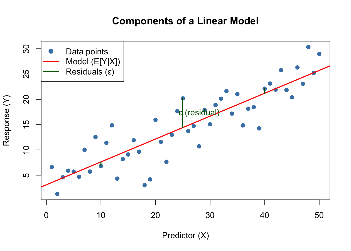 Figure 21.1: Components of a linear model showing data points, the fitted model line representing E[Y|X], and residuals (ε) as vertical deviations from the line