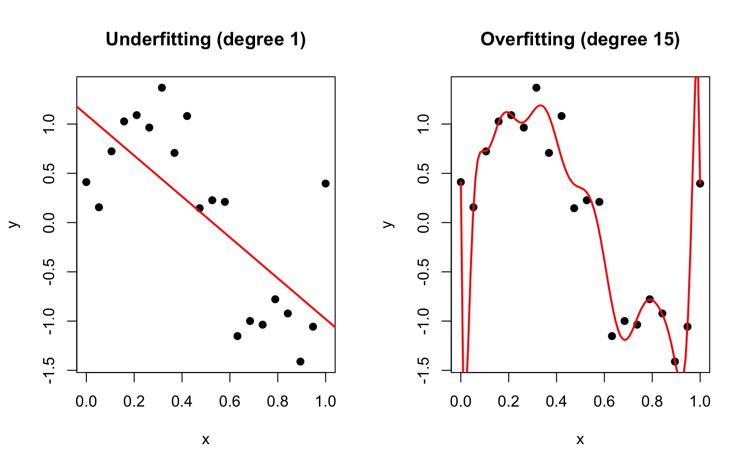 # Demonstrate overfitting with polynomial regressionset.seed(42)n <-20x <-seq(0, 1, length.out = n)y_true <-sin(2*pi*x)y <- y_true +rnorm(n, sd =0.3)par(mfrow =c(1, 2))# Underfitting (too simple)plot(x, y, pch =19, main ="Underfitting (degree 1)")abline(lm(y ~ x), col ="red", lwd =2)# Overfitting (too complex)plot(x, y, pch =19, main ="Overfitting (degree 15)")x_new <-seq(0, 1, length.out =100)lines(x_new, predict(lm(y ~poly(x, 15)),newdata =data.frame(x = x_new)),col ="red", lwd =2)