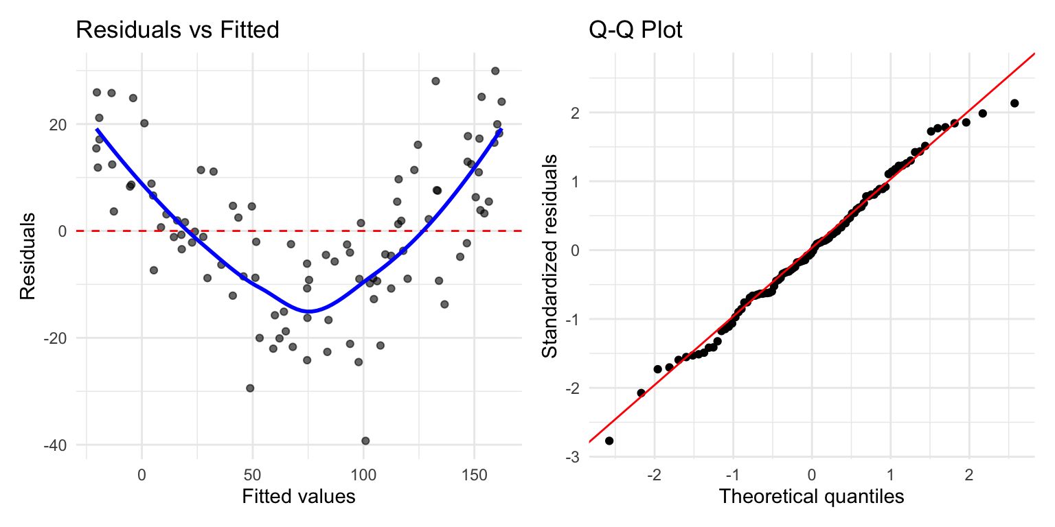 # Example of problematic residualsset.seed(123)x_prob <-seq(1, 10, length.out =50)y_prob <- x_prob^2+rnorm(50, sd =5) # Quadratic relationshiplm_prob <-lm(y_prob ~ x_prob)par(mfrow =c(1, 2))plot(x_prob, y_prob, pch =19, main ="Data with Non-linear Pattern")abline(lm_prob, col ="red", lwd =2)plot(fitted(lm_prob), residuals(lm_prob), pch =19,xlab ="Fitted values", ylab ="Residuals",main ="Residuals Show Clear Pattern")abline(h =0, col ="red", lty =2)