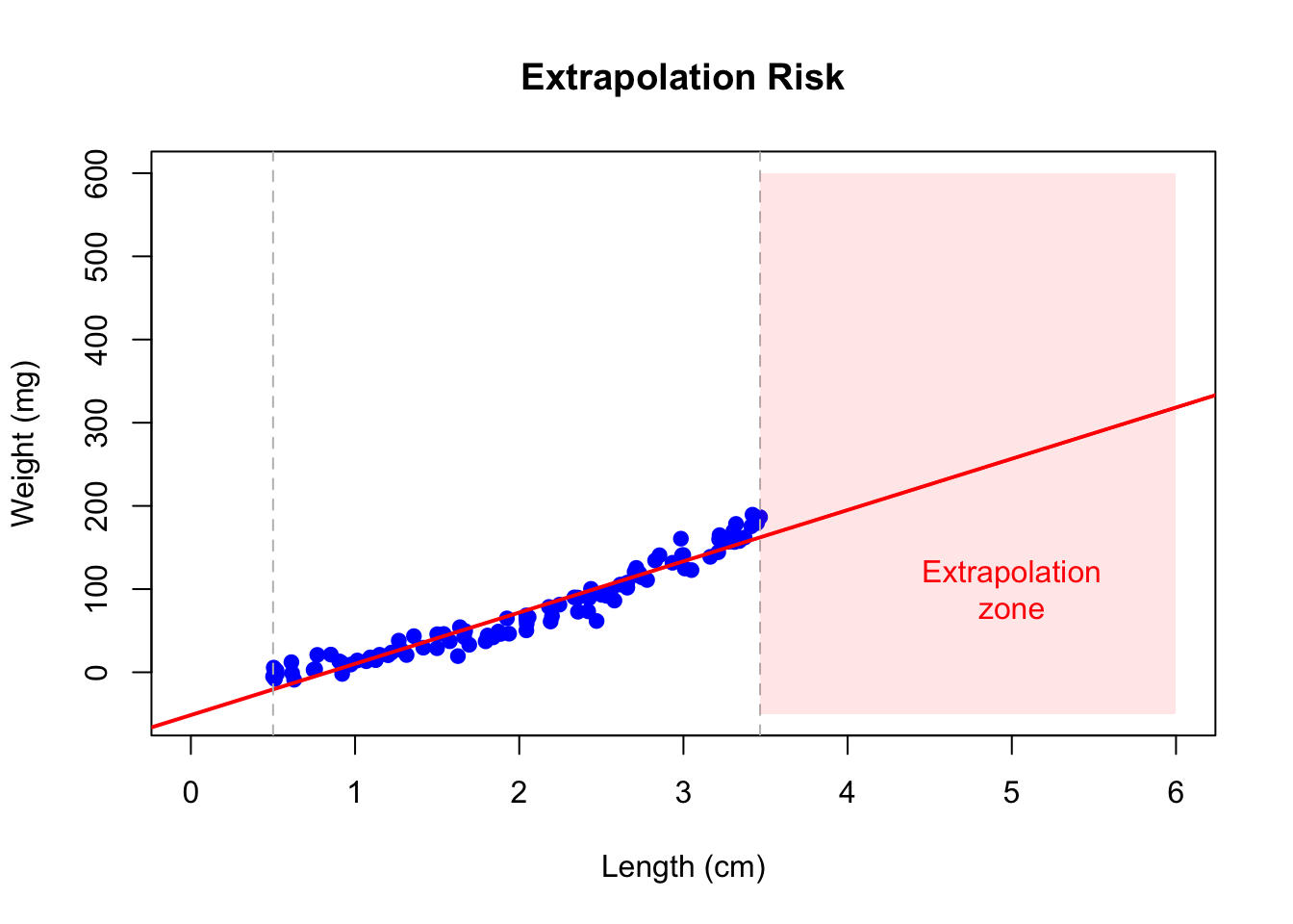 # Danger of extrapolationplot(length_cm, weight_mg, pch =19, col ="blue",xlim =c(0, 6), ylim =c(-50, 600),xlab ="Length (cm)", ylab ="Weight (mg)",main ="Extrapolation Risk")abline(fish_lm, col ="red", lwd =2)abline(v =c(min(length_cm), max(length_cm)), col ="gray", lty =2)# Mark extrapolation zonerect(max(length_cm), -50, 6, 600, col =rgb(1, 0, 0, 0.1), border =NA)text(5, 100, "Extrapolation\nzone", col ="red")