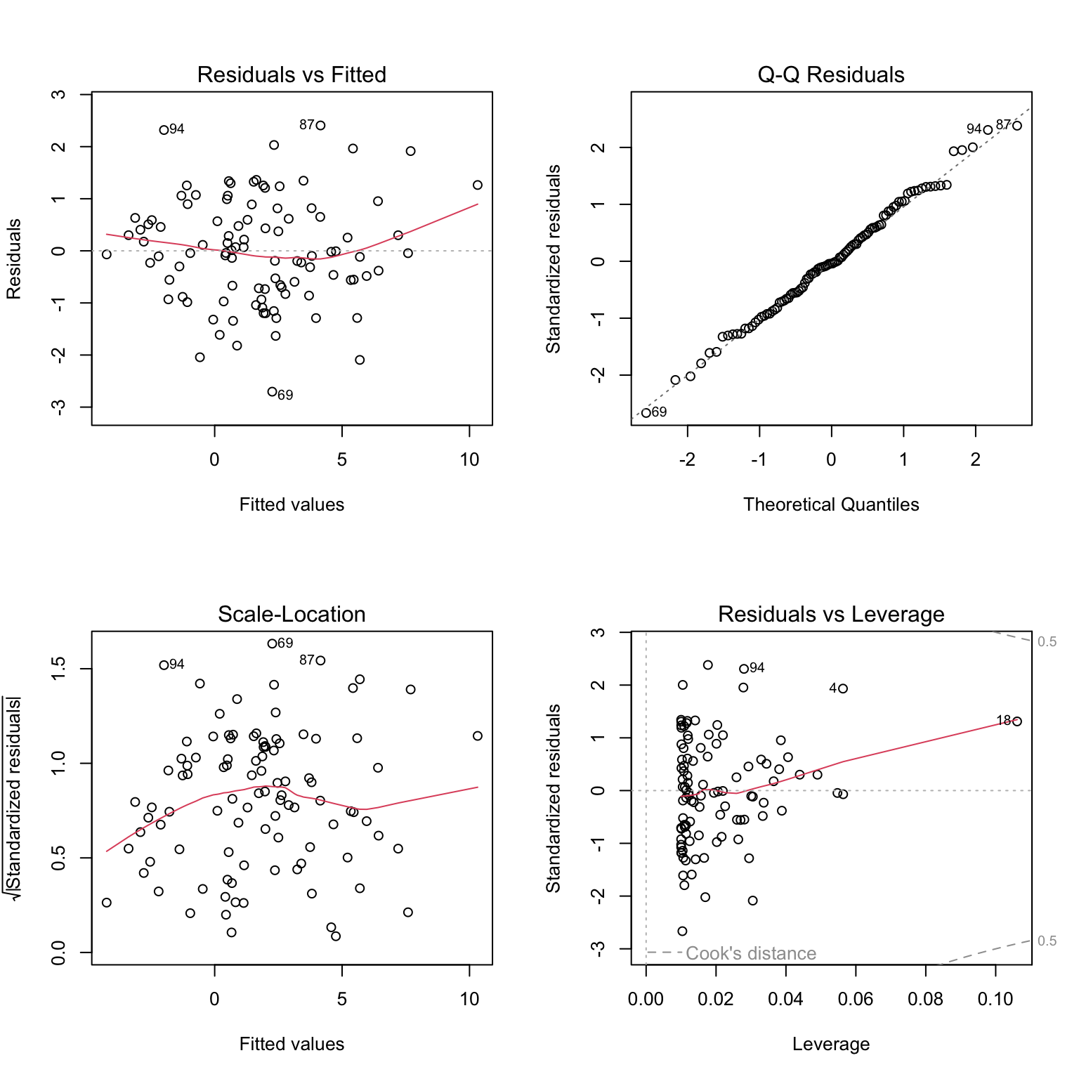 Figure 23.6: Complete set of standard diagnostic plots for regression model assessment including residuals vs fitted, Q-Q plot, scale-location, and residuals vs leverage