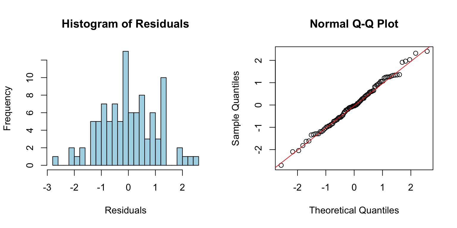 Figure 23.4: Checking normality assumption using histogram and Q-Q plot of residuals from a well-fitting model