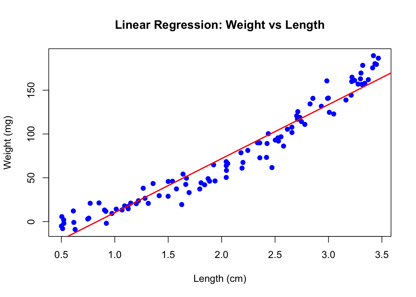 # Visualize the fitplot(length_cm, weight_mg, pch =19, col ="blue",xlab ="Length (cm)", ylab ="Weight (mg)",main ="Linear Regression: Weight vs Length")abline(fish_lm, col ="red", lwd =2)