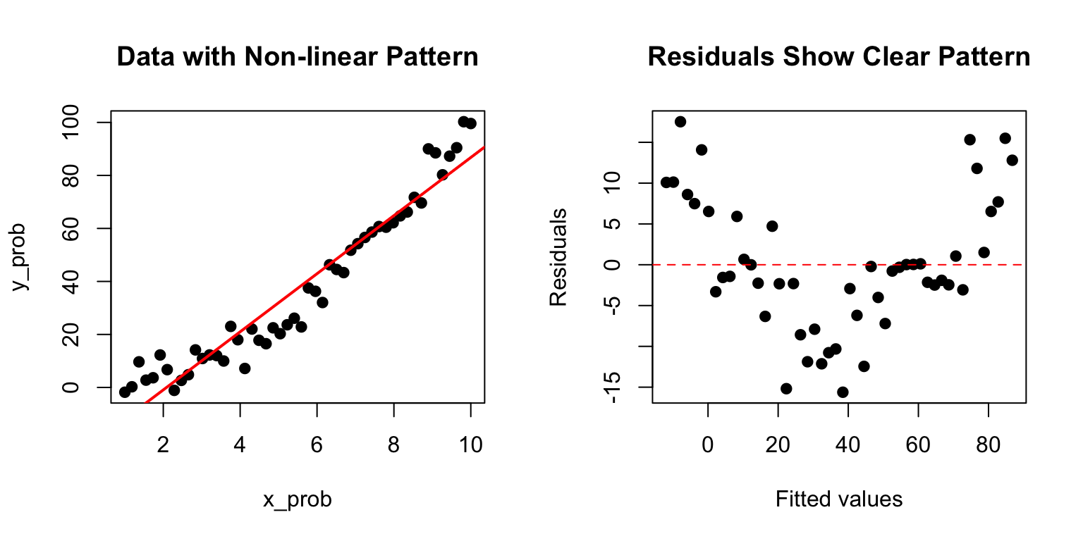 # Example of problematic residualsset.seed(123)x_prob <-seq(1, 10, length.out =50)y_prob <- x_prob^2+rnorm(50, sd =5) # Quadratic relationshiplm_prob <-lm(y_prob ~ x_prob)par(mfrow =c(1, 2))plot(x_prob, y_prob, pch =19, main ="Data with Non-linear Pattern")abline(lm_prob, col ="red", lwd =2)plot(fitted(lm_prob), residuals(lm_prob), pch =19,xlab ="Fitted values", ylab ="Residuals",main ="Residuals Show Clear Pattern")abline(h =0, col ="red", lty =2)