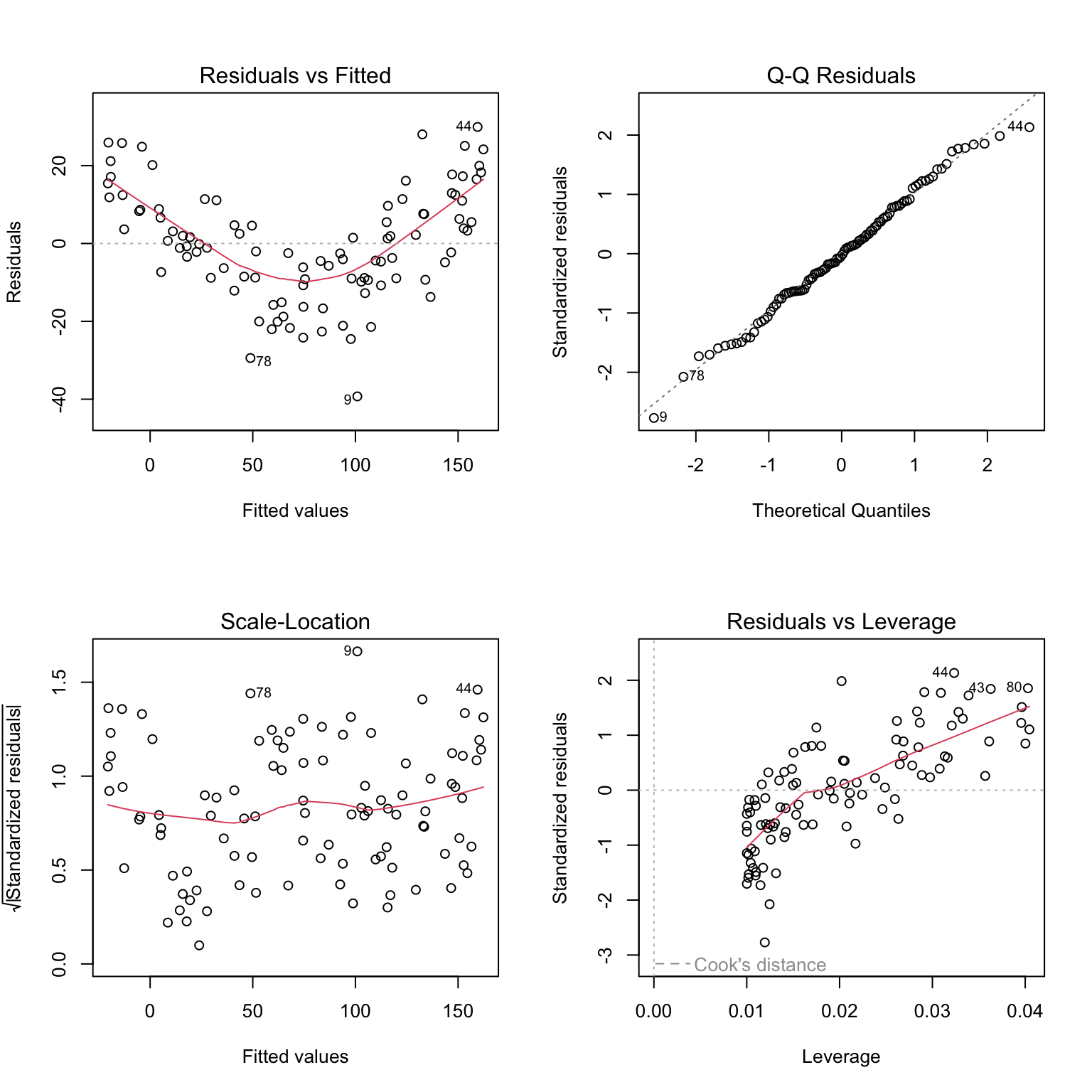 Figure 23.8: Standard residual diagnostic plots for linear regression including residuals vs fitted, Q-Q plot, scale-location, and residuals vs leverage