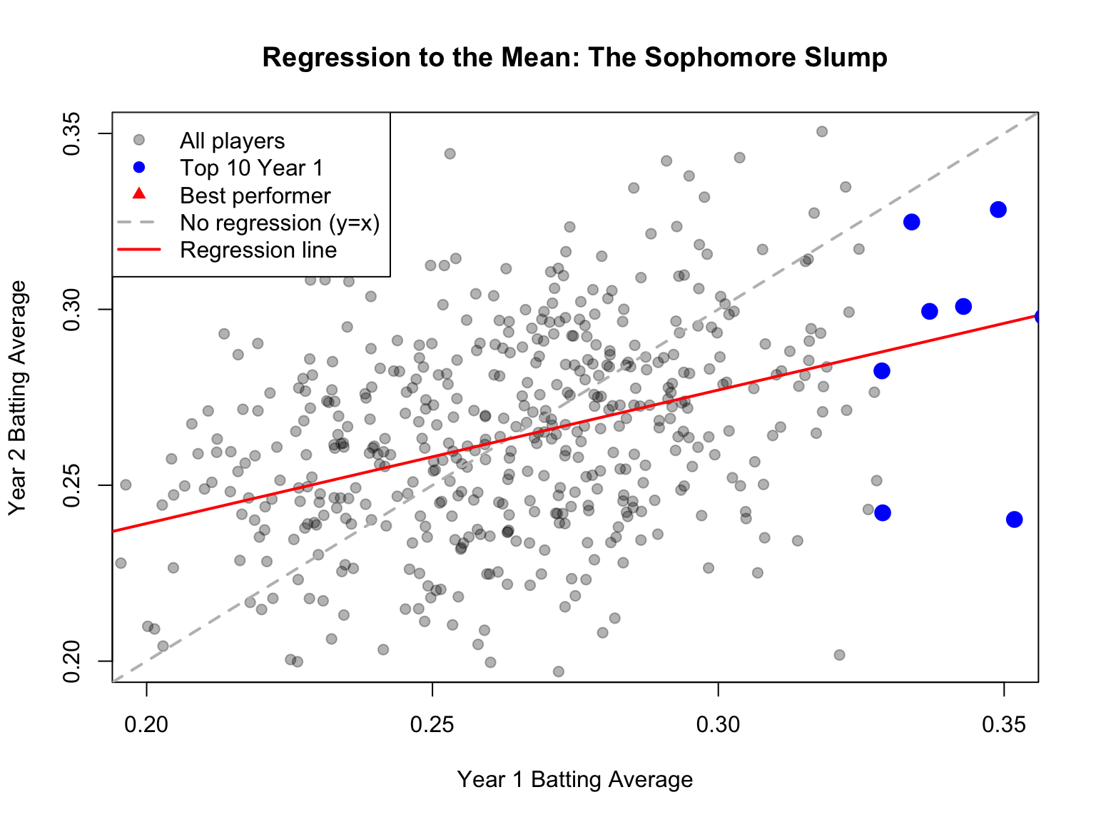 Figure 23.3: Visualization of regression to the mean in baseball batting averages, showing how top Year 1 performers tend to decline in Year 2, not due to a sophomore slump but statistical regression