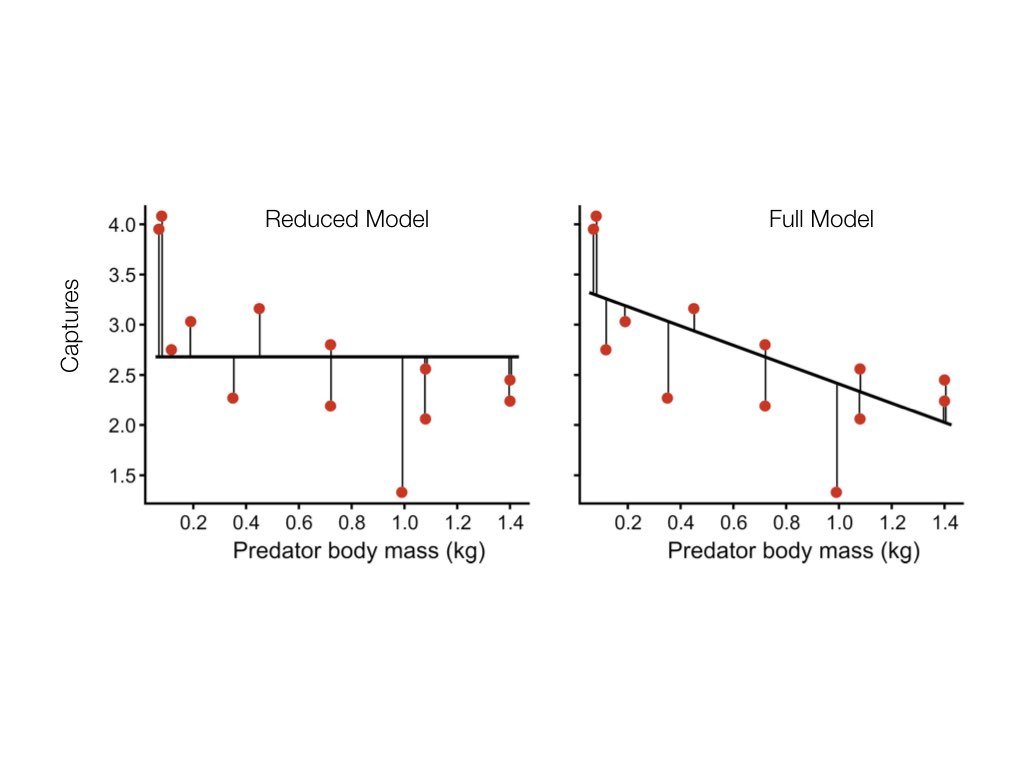 # Model I slope estimateslope_model1 <-coef(fish_lm)[2]# Reduced Major Axis slope estimate (ratio of standard deviations)slope_rma <-sd(weight_mg) /sd(length_cm) *sign(cor(length_cm, weight_mg))cat("Model I (OLS) slope:", round(slope_model1, 3), "\n")