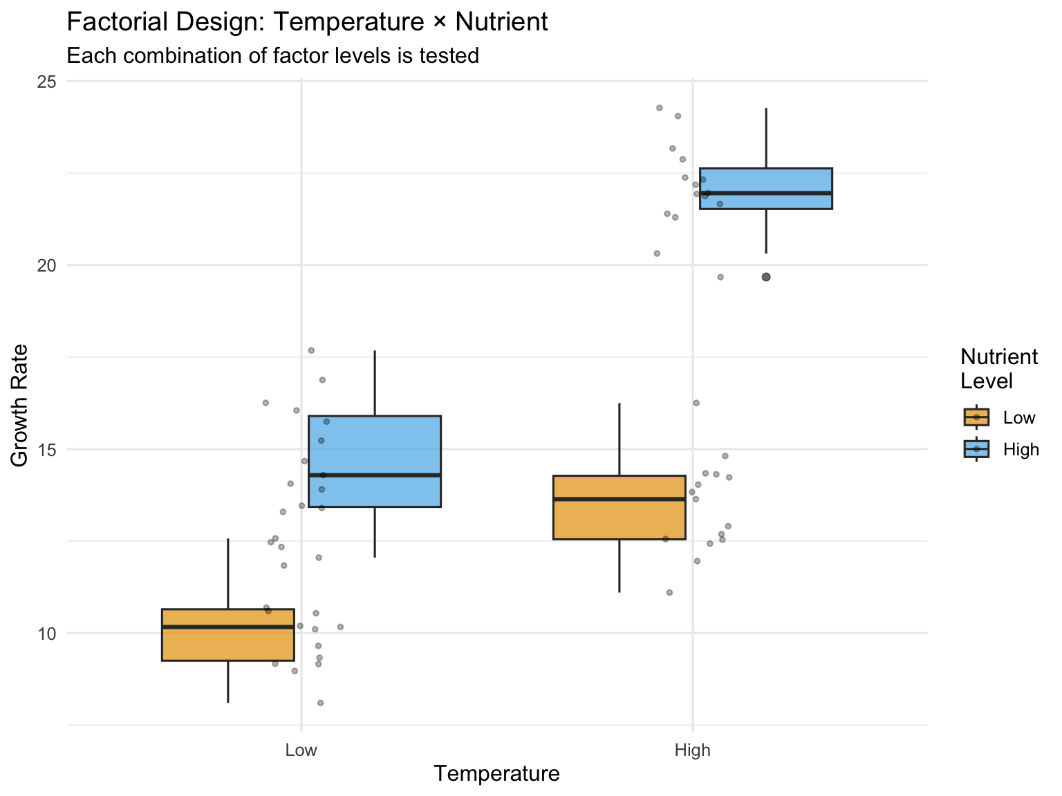 # Simulated factorial experiment: Temperature × Nutrient effects on growthset.seed(123)n <-15# replicates per treatment# Create factorial design datatemperature <-rep(c("Low", "High"), each =2*n)nutrient <-rep(rep(c("Low", "High"), each = n), 2)# Simulate growth with main effects AND interaction# Low temp & low nutrient: baseline 10# High nutrient adds 5# High temp adds 3# BUT interaction: high temp × high nutrient gives extra boost of 4growth <-numeric(4*n)growth[temperature =="Low"& nutrient =="Low"] <-rnorm(n, 10, 1.5)growth[temperature =="Low"& nutrient =="High"] <-rnorm(n, 15, 1.5)growth[temperature =="High"& nutrient =="Low"] <-rnorm(n, 13, 1.5)growth[temperature =="High"& nutrient =="High"] <-rnorm(n, 22, 1.5) # Synergistic effectfactorial_data <-data.frame(temperature =factor(temperature, levels =c("Low", "High")),nutrient =factor(nutrient, levels =c("Low", "High")),growth = growth)# Visualize the designggplot(factorial_data, aes(x = temperature, y = growth, fill = nutrient)) +geom_boxplot(alpha =0.7) +geom_jitter(width =0.1, alpha =0.3, size =1) +labs(title ="Factorial Design: Temperature × Nutrient",subtitle ="Each combination of factor levels is tested",x ="Temperature",y ="Growth Rate",fill ="Nutrient\nLevel") +scale_fill_manual(values =c("Low"="#E69F00", "High"="#56B4E9")) +theme_minimal(base_size =12)