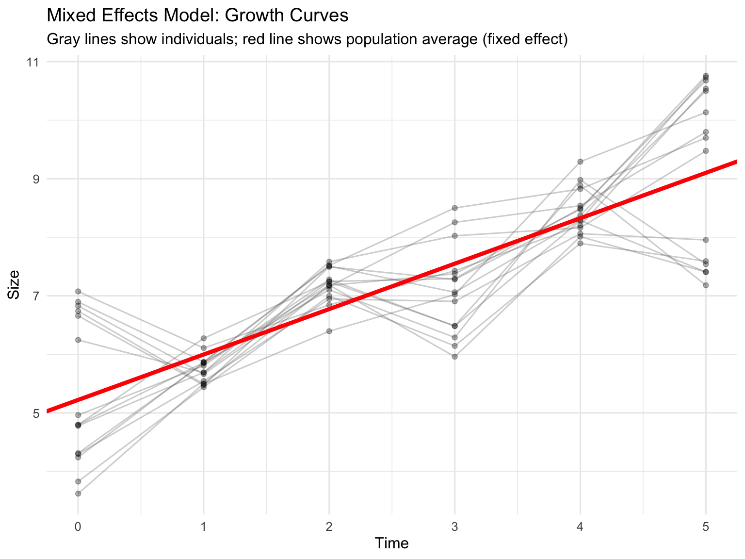 where: - \(\mu\) is the overall mean - \(\alpha_i\) is the effect of group \(i\) - \(\beta\) is the regression slope (common to all groups) - \(x_{ij}\) is the covariate value - \(\bar{x}\) is the mean of the covariate - \(\epsilon_{ij}\) is the random error