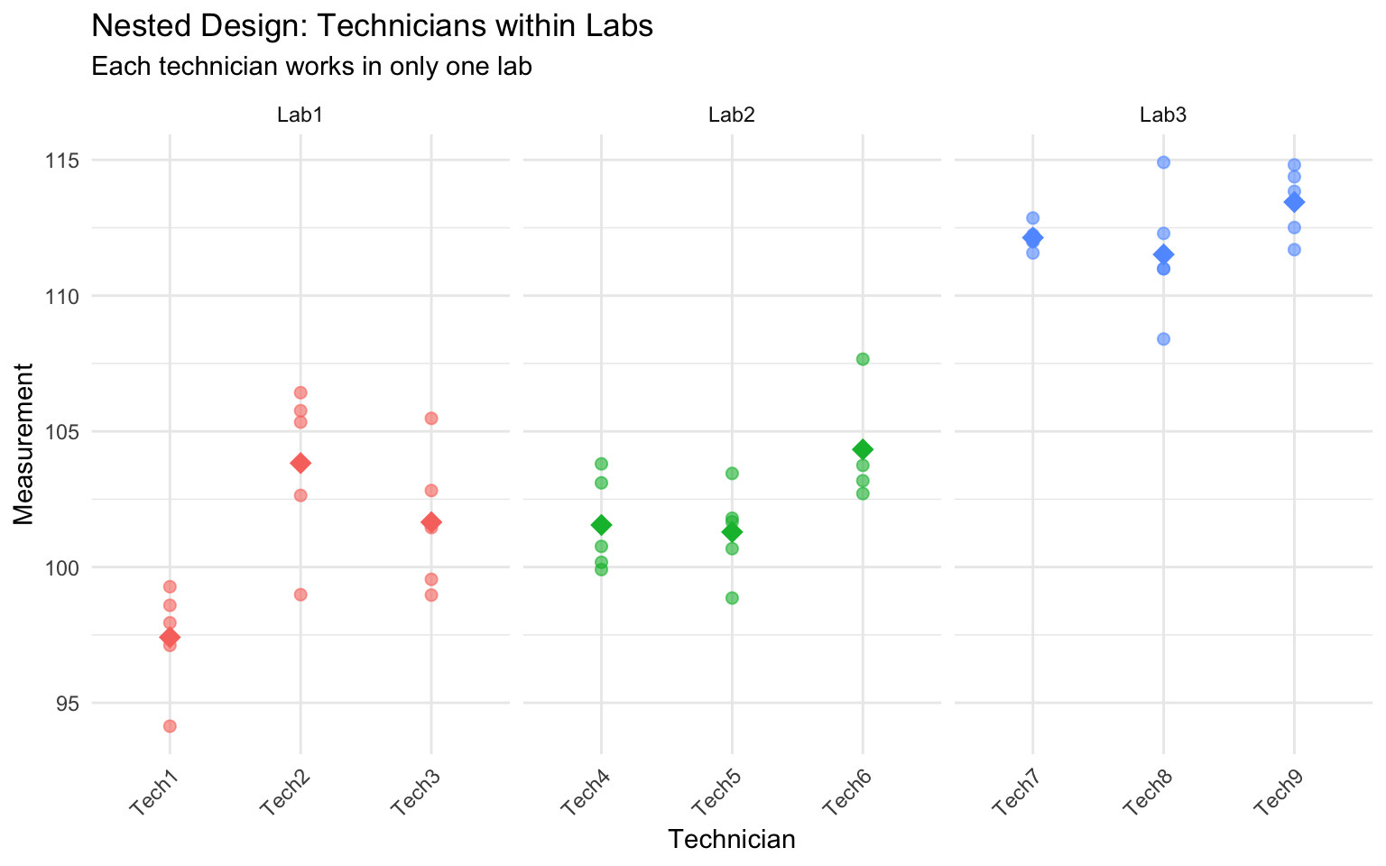 Nested vs. Crossed: For each scenario, identify whether the design is nested or crossed: