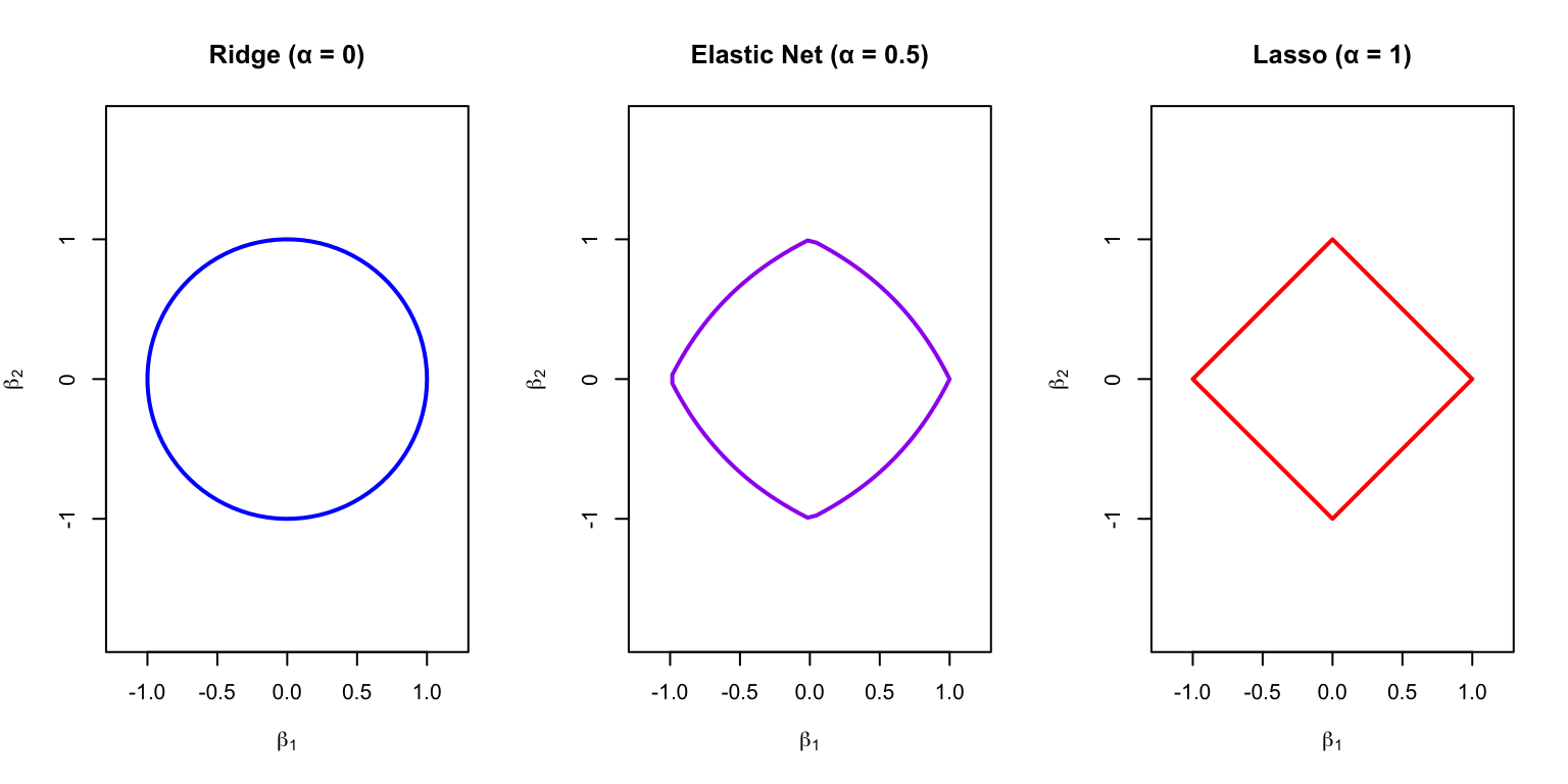 par(mfrow =c(1, 3))# Ridgeplot(cos(theta), sin(theta), type ="l", lwd =2, col ="blue",asp =1, xlim =c(-1.2, 1.2), ylim =c(-1.2, 1.2),xlab =expression(beta[1]), ylab =expression(beta[2]),main ="Ridge (α = 0)")# Elastic netalpha_en <-0.5en_x <- en_y <-numeric(100)for (i in1:100) {# Approximate elastic net constraint boundary ang <- theta[i] r <-1/ (alpha_en * (abs(cos(ang)) +abs(sin(ang))) + (1- alpha_en)) en_x[i] <- r *cos(ang) en_y[i] <- r *sin(ang)}plot(en_x, en_y, type ="l", lwd =2, col ="purple",asp =1, xlim =c(-1.2, 1.2), ylim =c(-1.2, 1.2),xlab =expression(beta[1]), ylab =expression(beta[2]),main ="Elastic Net (α = 0.5)")# Lassoplot(diamond_x, diamond_y, type ="l", lwd =2, col ="red",asp =1, xlim =c(-1.2, 1.2), ylim =c(-1.2, 1.2),xlab =expression(beta[1]), ylab =expression(beta[2]),main ="Lasso (α = 1)")