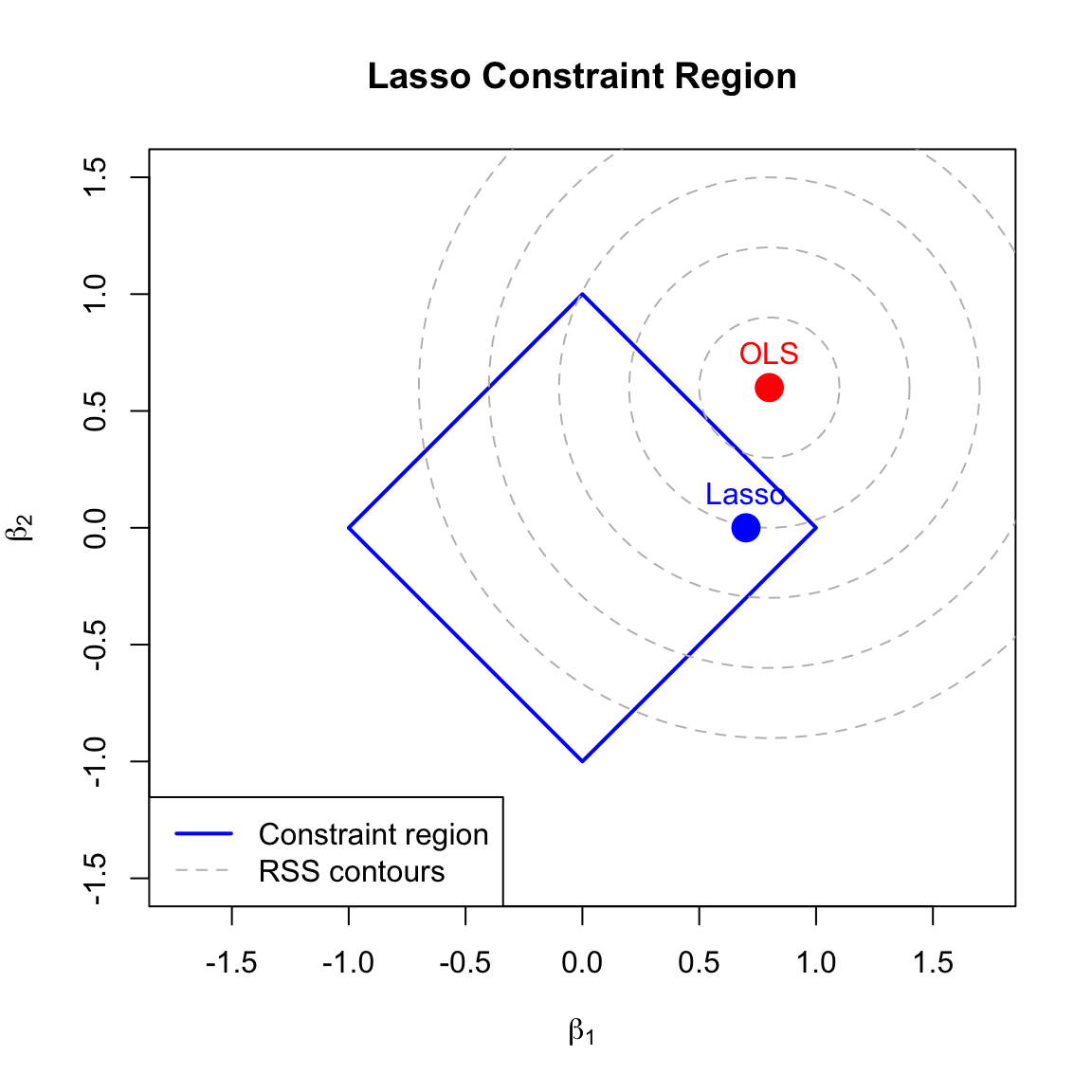 Figure 31.4: Geometric interpretation of lasso: the constraint region has corners on the axes, so the solution often lies at a corner where one or more coefficients are exactly zero