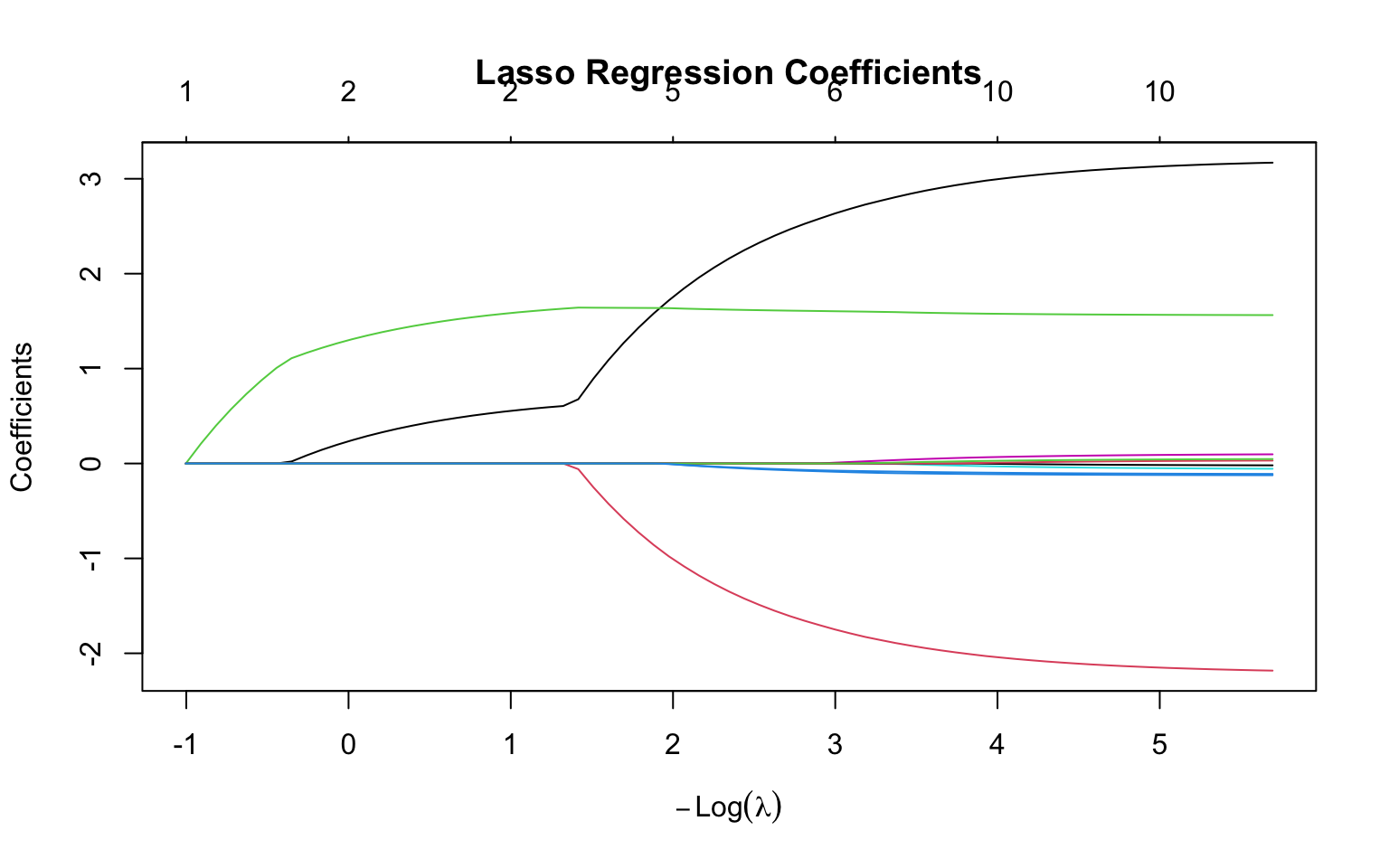 # Fit lasso regressionlasso_fit <-glmnet(X, y, alpha =1) # alpha = 1 for lassoplot(lasso_fit, xvar ="lambda", main ="Lasso Regression Coefficients")