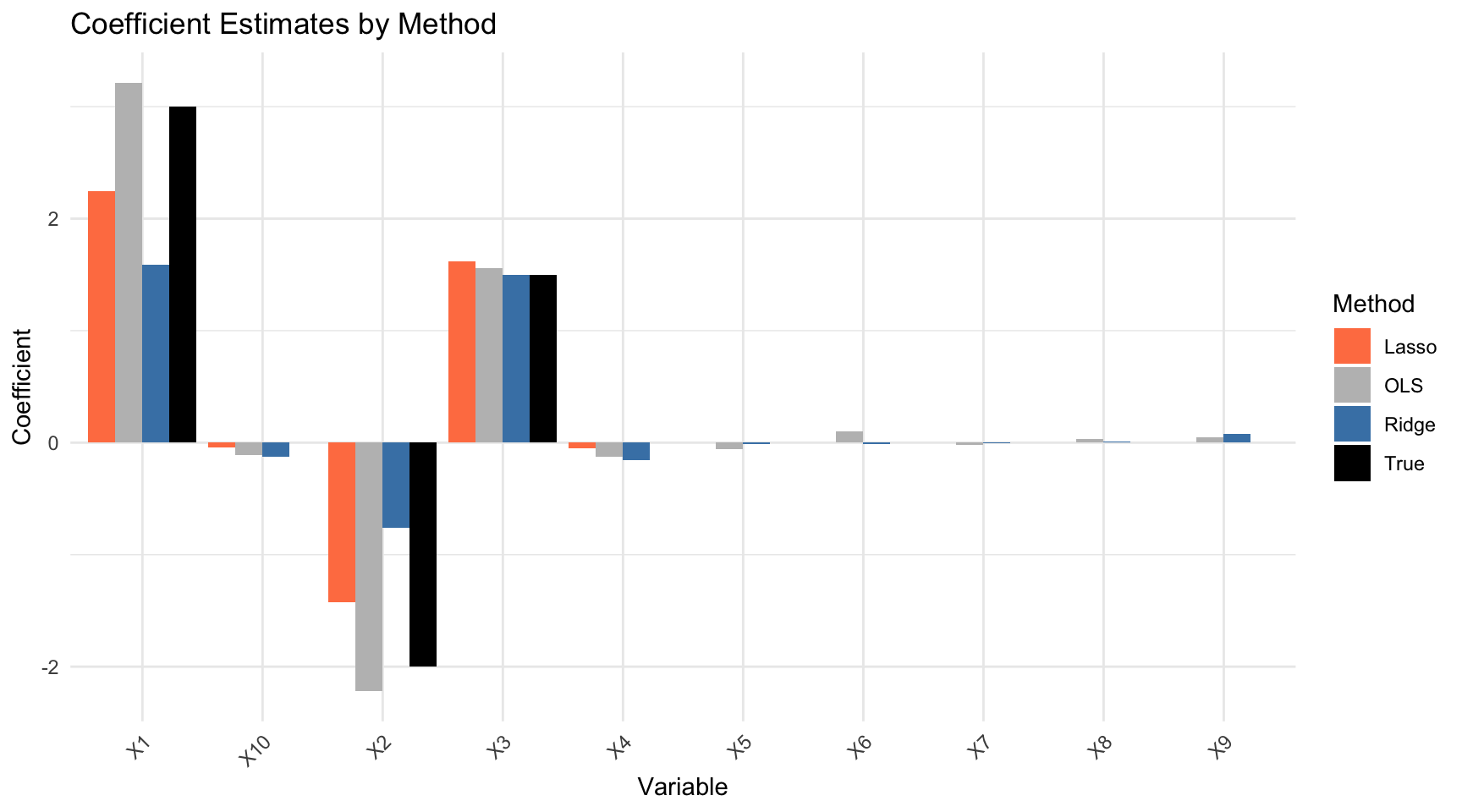 # Plot comparisonvar_names <-paste0("X", 1:p)coef_df <-data.frame(Variable =rep(var_names, 4),Method =rep(c("True", "OLS", "Ridge", "Lasso"), each = p),Coefficient =c(true_beta,as.vector(coef_ols)[-1],as.vector(coef_ridge)[-1],as.vector(coef_lasso)[-1]))ggplot(coef_df, aes(x = Variable, y = Coefficient, fill = Method)) +geom_bar(stat ="identity", position ="dodge") +scale_fill_manual(values =c("True"="black", "OLS"="gray","Ridge"="steelblue", "Lasso"="coral")) +theme(axis.text.x =element_text(angle =45, hjust =1)) +labs(title ="Coefficient Estimates by Method")
