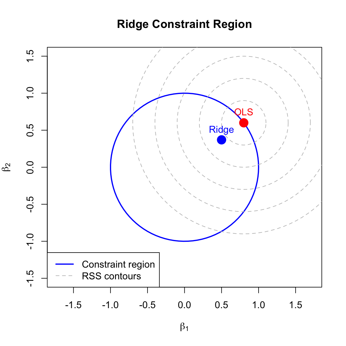 where \(t\) is inversely related to \(\lambda\). The OLS solution may lie outside this constraint region, so ridge finds the point where the RSS contours first touch the constraint boundary.