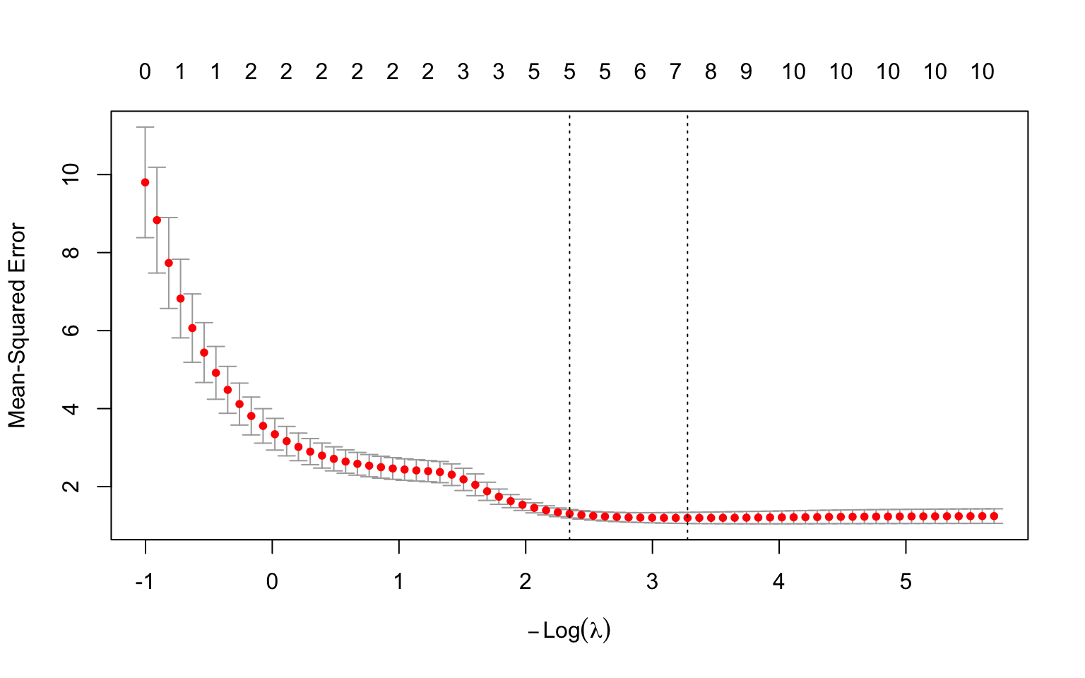Figure 32.7: Cross-validation to select optimal lambda: the left dashed line marks the minimum error, the right marks the most regularized model within one standard error