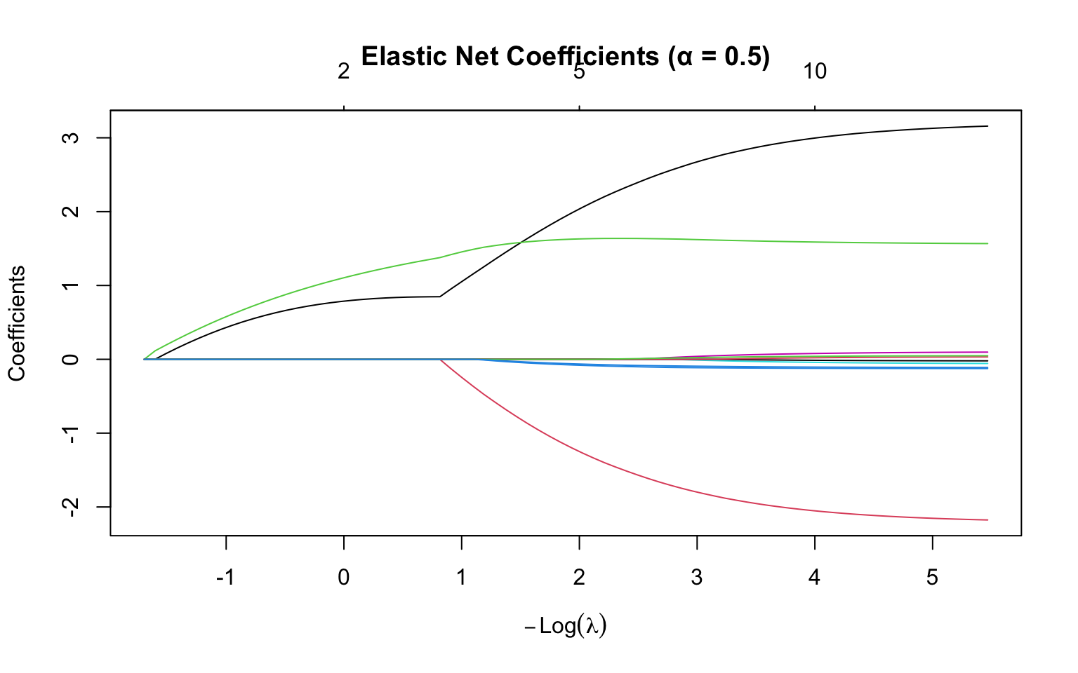 # Fit elastic netenet_fit <-glmnet(X, y, alpha =0.5)plot(enet_fit, xvar ="lambda", main ="Elastic Net Coefficients (α = 0.5)")