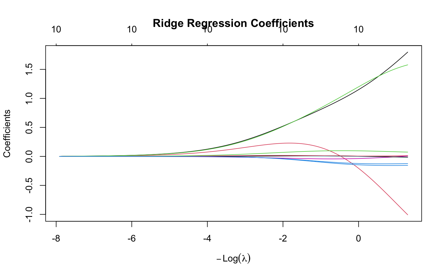 Figure 32.1: Ridge regression coefficient paths: as lambda increases, coefficients shrink toward zero but never reach exactly zero