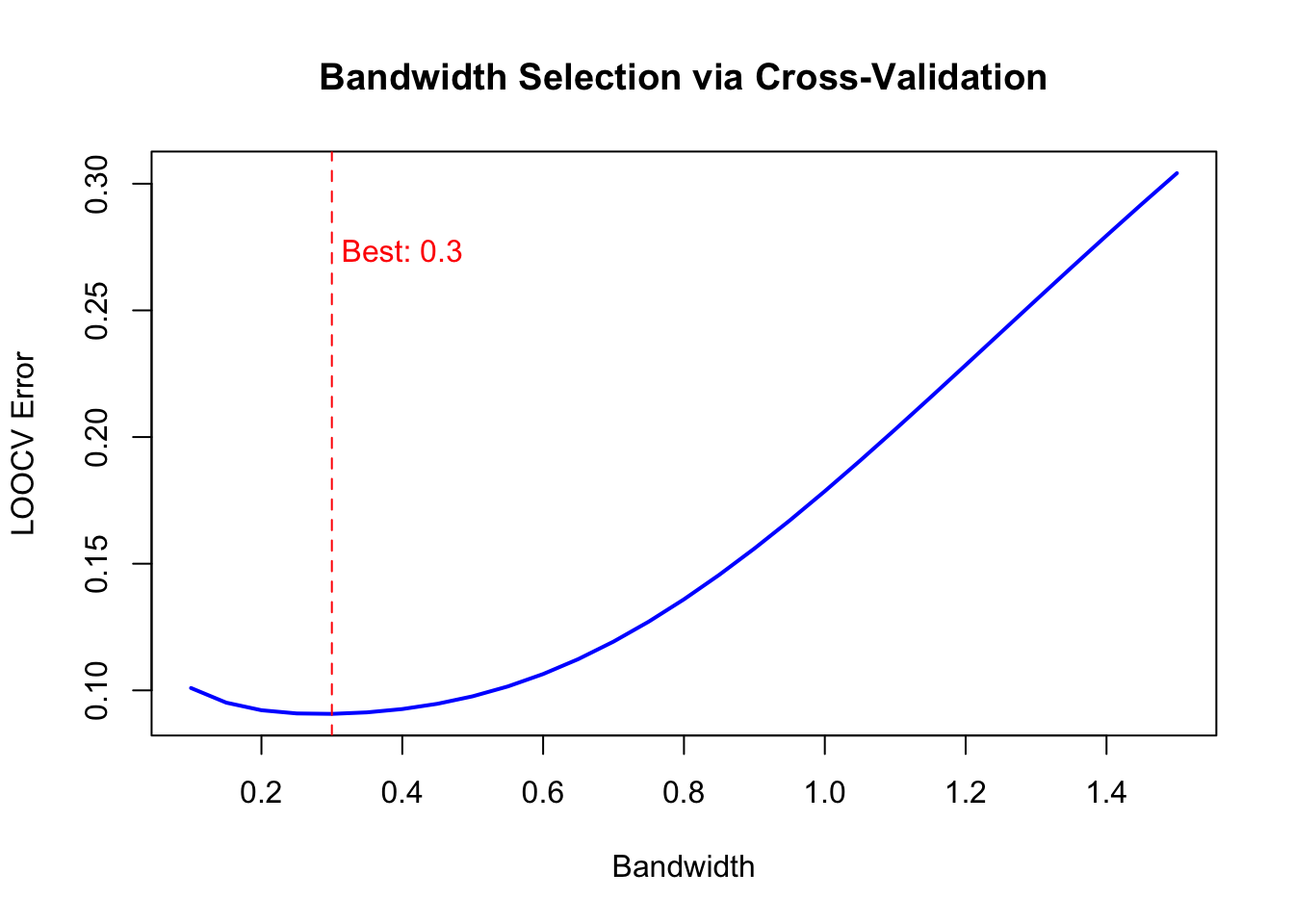 # Leave-one-out CV for bandwidth selectionbandwidths <-seq(0.1, 1.5, by =0.05)cv_errors <-sapply(bandwidths, function(bw) { errors <-sapply(1:n, function(i) {# Leave out observation i y_pred <-kernel_smooth(x[i], x[-i], y[-i], bw) (y[i] - y_pred)^2 })mean(errors)})plot(bandwidths, cv_errors, type ="l", lwd =2, col ="blue",xlab ="Bandwidth", ylab ="LOOCV Error",main ="Bandwidth Selection via Cross-Validation")best_bw <- bandwidths[which.min(cv_errors)]abline(v = best_bw, lty =2, col ="red")text(best_bw +0.1, max(cv_errors) *0.9, paste("Best:", round(best_bw, 2)), col ="red")