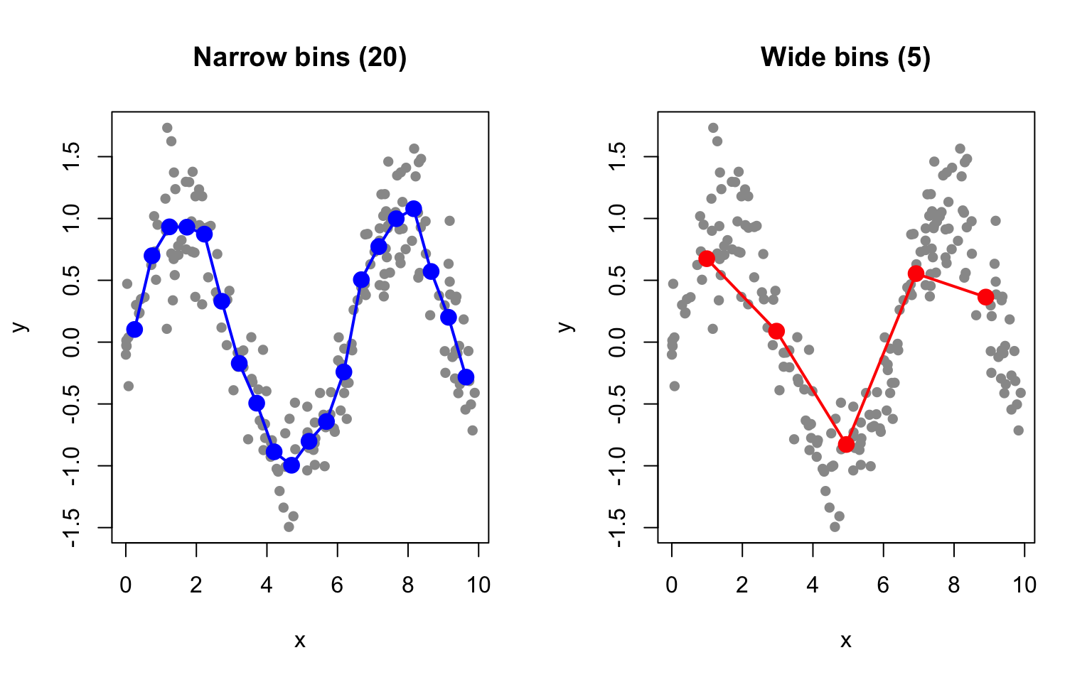 # Generate non-linear dataset.seed(42)n <-200x <-runif(n, 0, 10)y <-sin(x) +rnorm(n, sd =0.3)# Bin smoothing with different bin widthspar(mfrow =c(1, 2))# Narrow binsn_bins <-20breaks <-seq(min(x), max(x), length.out = n_bins +1)bin_means <-sapply(1:n_bins, function(i) { in_bin <- x >= breaks[i] & x < breaks[i +1]if (sum(in_bin) >0) mean(y[in_bin]) elseNA})bin_centers <- (breaks[-1] + breaks[-(n_bins +1)]) /2plot(x, y, pch =16, col ="gray60", main ="Narrow bins (20)")points(bin_centers, bin_means, col ="blue", pch =19, cex =1.5)lines(bin_centers, bin_means, col ="blue", lwd =2)# Wide binsn_bins <-5breaks <-seq(min(x), max(x), length.out = n_bins +1)bin_means <-sapply(1:n_bins, function(i) { in_bin <- x >= breaks[i] & x < breaks[i +1]if (sum(in_bin) >0) mean(y[in_bin]) elseNA})bin_centers <- (breaks[-1] + breaks[-(n_bins +1)]) /2plot(x, y, pch =16, col ="gray60", main ="Wide bins (5)")points(bin_centers, bin_means, col ="red", pch =19, cex =1.5)lines(bin_centers, bin_means, col ="red", lwd =2)